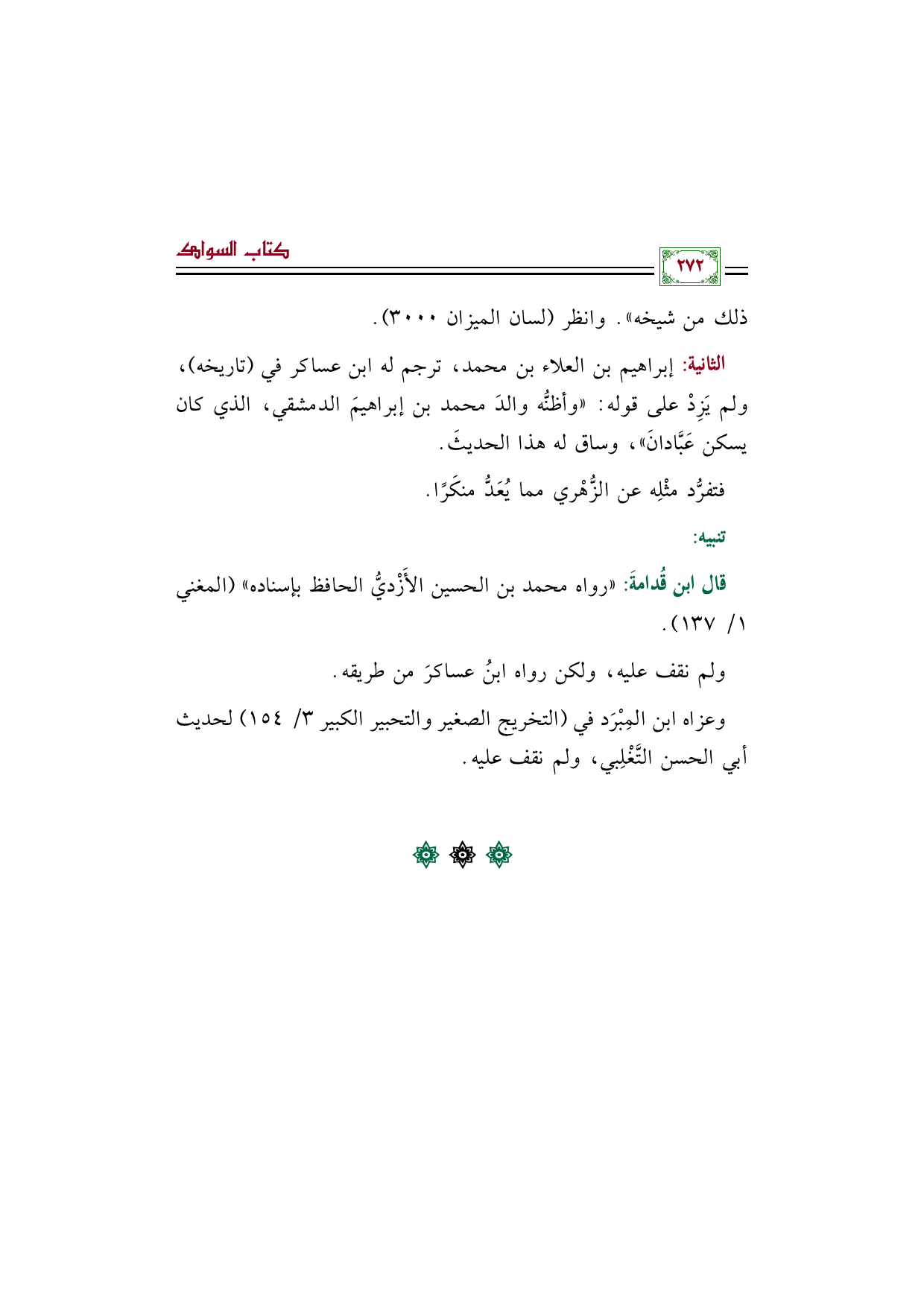 الثانية: إبراهيم بن العلاء بن محمد، ترجم له ابن عساكر في (تاريخه)، ولم يَزِدْ على قوله: "وأظنُّه والدَ محمد بن إبراهيمَ الدمشقي، الذي كان يسكن عَبَّادانَ"، وساق له هذا الحديثَ.