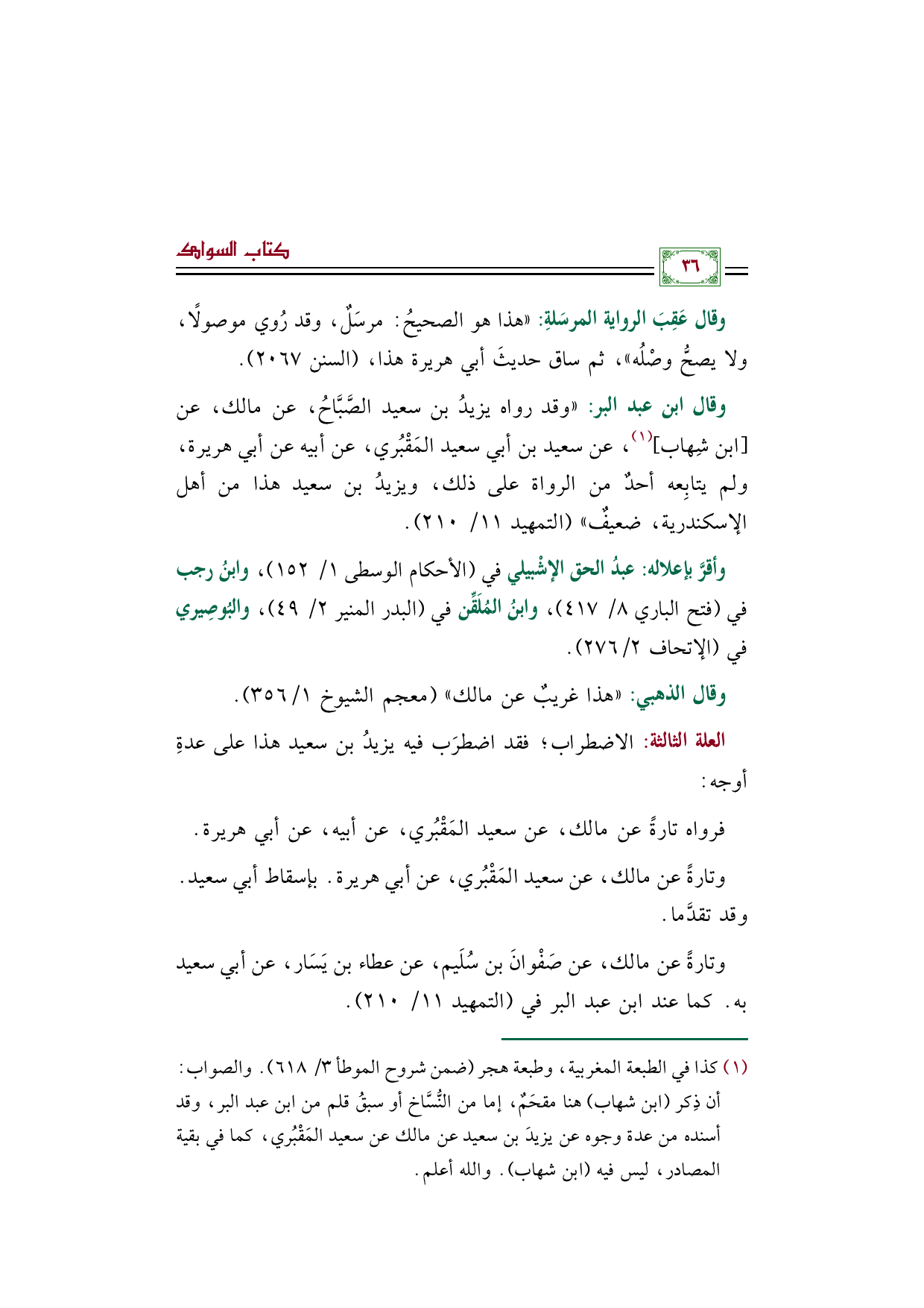 وقال ابن عبد البر: "وقد رواه يزيدُ بن سعيد الصَّبَّاحُ، عن مالك، عن [ابن شِهاب] (¬١)، عن سعيد بن أبي سعيد المَقْبُري، عن أبيه عن أبي هريرة، ولم يتابِعه أحدٌ من الرواة على ذلك، ويزيدُ بن سعيد هذا من أهل الإسكندرية، ضعيفٌ" (التمهيد ١١/ ٢١٠).
