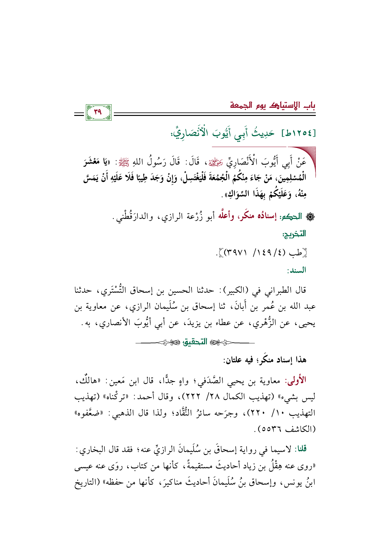 قال الطبراني في (الكبير): حدثنا الحسين بن إسحاق التُّسْتَري، حدثنا عبد الله بن عُمر بن أَبانَ، ثنا إسحاق بن سُلَيمان الرازي، عن معاوية بن يحيى، عن الزُّهْري، عن عطاء بن يزيدَ، عن أبي أيُّوبَ الأنصاري، به.