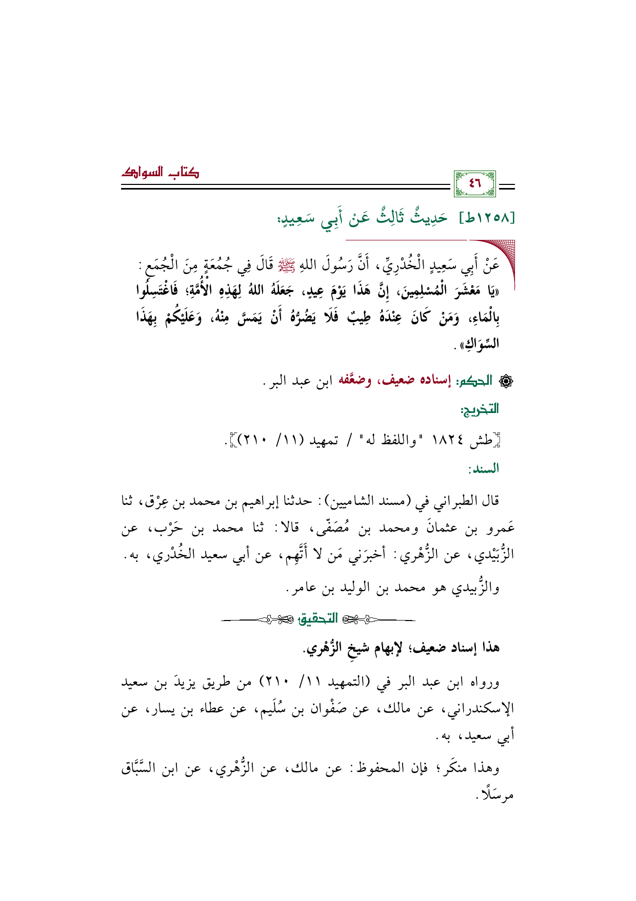 قال الطبراني في (مسند الشاميين): حدثنا إبراهيم بن محمد بن عِرْق، ثنا عَمرو بن عثمانَ ومحمد بن مُصَفّى، قالا: ثنا محمد بن حَرْب، عن الزُّبَيْدي، عن الزُّهْري: أخبرَني مَن لا أَتَّهِم، عن أبي سعيد الخُدْري، به.