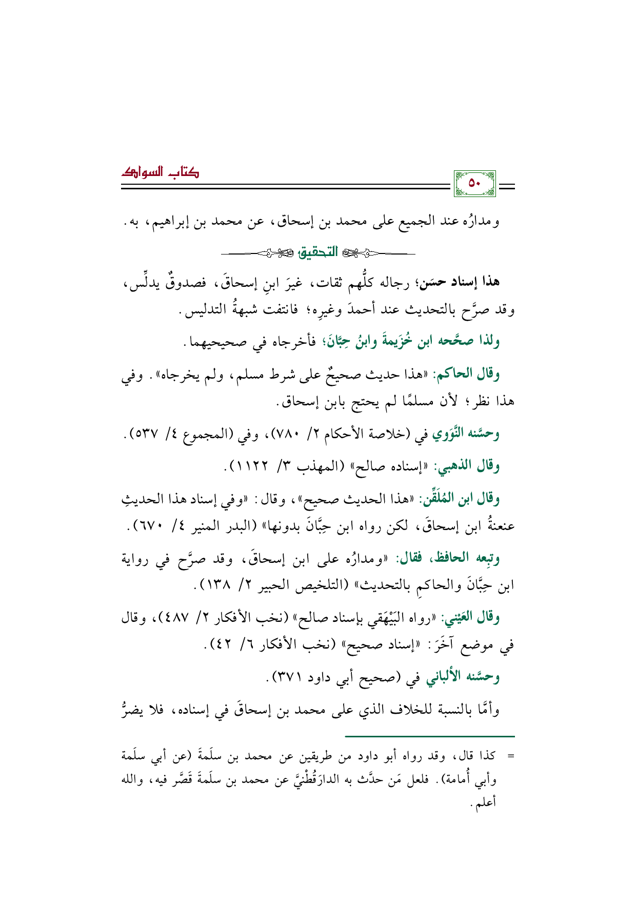 وأمَّا بالنسبة للخلاف الذي على محمد بن إسحاقَ في إسناده، فلا يضرُّ
