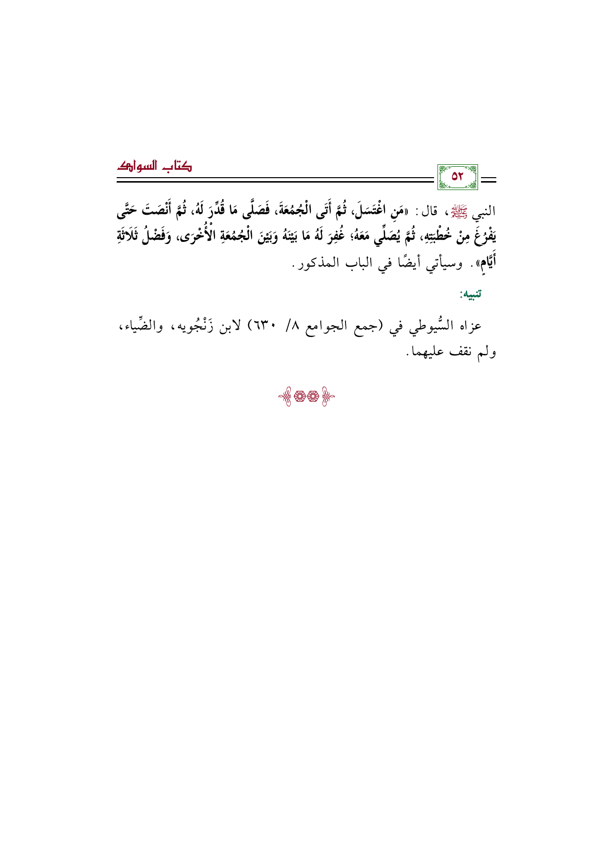 النبي صلى الله عليه وسلم، قال: ((مَنِ اغْتَسَلَ، ثُمَّ أَتَى الْجُمُعَةَ، فَصَلَّى مَا قُدِّرَ لَهُ، ثُمَّ أَنْصَتَ حَتَّى يَفْرُغَ مِنْ خُطْبَتِهِ، ثُمَّ يُصَلِّي مَعَهُ؛ غُفِرَ لَهُ مَا بَيْنَهُ وَبَيْنَ الْجُمُعَةِ الْأُخْرَى، وَفَضْلُ ثَلَاثَةِ أَيَّامٍ)). وسيأتي أيضًا في الباب المذكور.