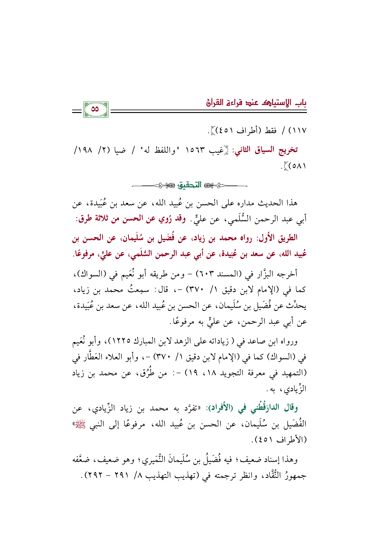 أخرجه البزَّار في (المسند ٦٠٣) - ومن طريقه أبو نُعَيم في "السواك"، كما في (الإمام لابن دقيق ١/ ٣٧٠) -، قال: سمِعتُ محمد بن زياد، يحدِّث عن فُضَيل بن سُلَيمان، عن الحسن بن عُبيد الله، عن سعد بن عُبَيدة، عن أبي عبد الرحمن، عن عليٍّ به مرفوعًا.