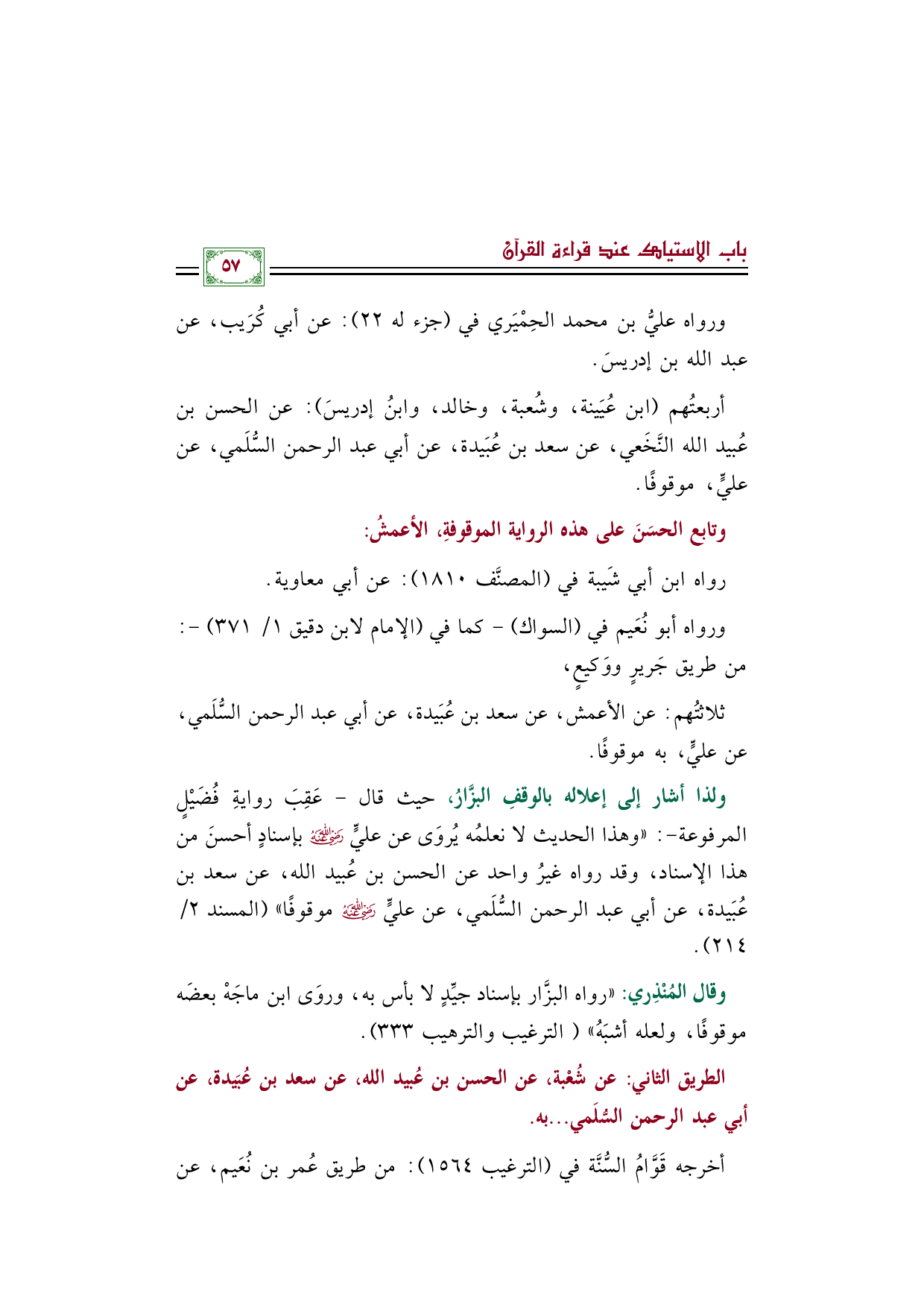 ولذا أشار إلى إعلاله بالوقفِ البزَّارُ، حيث قال- عَقِبَ روايةِ فُضَيْلٍ المرفوعة-: "وهذا الحديث لا نعلمُه يُروَى عن عليٍّ رضي الله عنه بإسنادٍ أحسنَ من هذا الإسناد، وقد رواه غيرُ واحد عن الحسن بن عُبيد الله، عن سعد بن عُبَيدة، عن أبي عبد الرحمن السُّلَمي، عن عليٍّ رضي الله عنه موقوفًا" (المسند ٢/ ٢١٤).