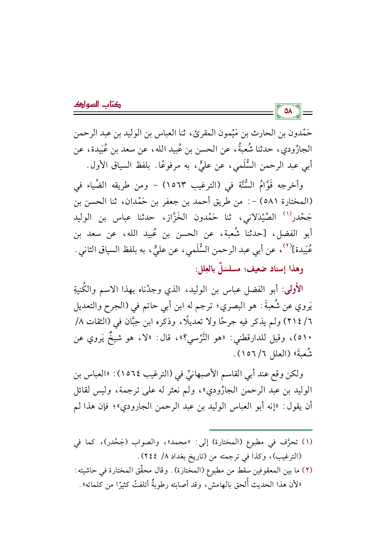 ولكن وقع عند أبي القاسم الأصبهانيِّ في (الترغيب ١٥٦٤): "العباس بن الوليد بن عبد الرحمن الجارُودي"، ولم نعثر له على ترجمة، وليس لقائل أن يقول: "إنه أبو العباس الوليد بن عبد الرحمن الجارودي"؛ فإن هذا لم