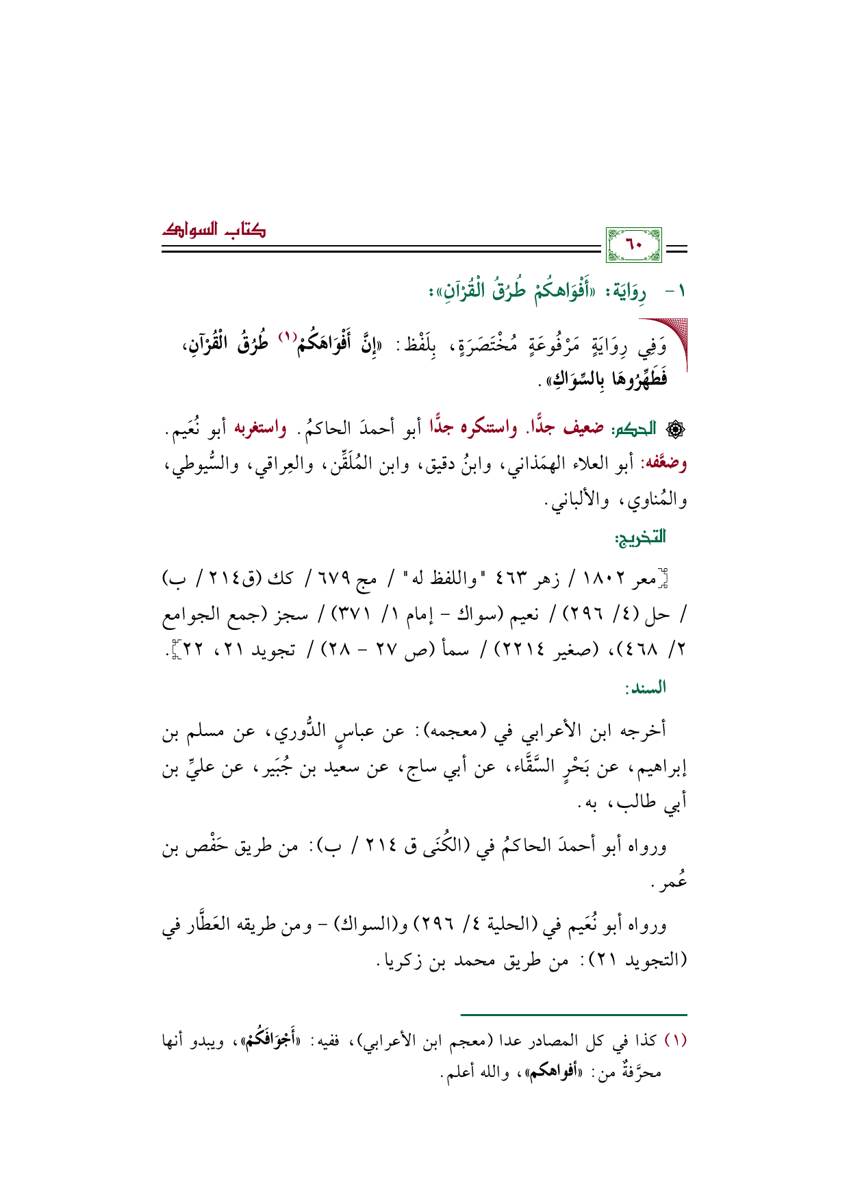 ورواه أبو نُعَيم في (الحلية ٤/ ٢٩٦) و (السواك) - ومن طريقه العَطَّار في (التجويد ٢١): من طريق محمد بن زكريا.