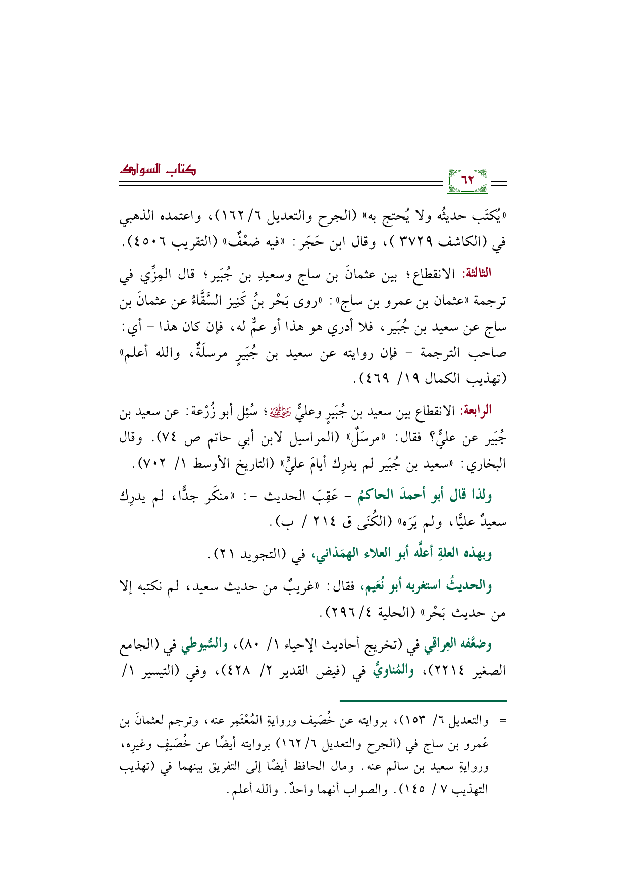 الثالثة: الانقطاع؛ بين عثمانَ بن ساج وسعيدِ بن جُبَير؛ قال المِزِّي في ترجمة "عثمان بن عمرو بن ساج": "روى بَحْر بنُ كَنِيز السَّقَّاءُ عن عثمانَ بن ساج عن سعيد بن جُبَير، فلا أدري هو هذا أو عمٌّ له، فإن كان هذا - أي: صاحب الترجمة- فإن روايته عن سعيد بن جُبَيرٍ مرسلَةٌ، والله أعلم" (تهذيب الكمال ١٩/ ٤٦٩).