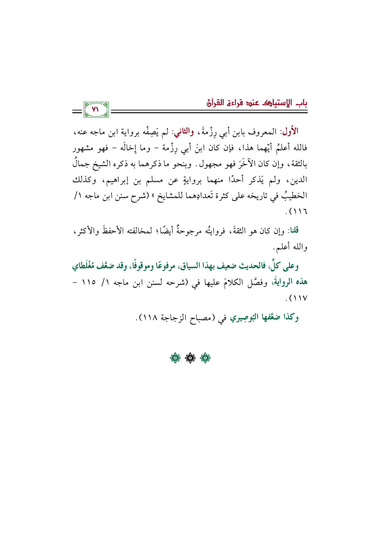 الأول: المعروف بابن أبي رِزْمةَ، والثاني: لم يَصِفْه برواية ابن ماجه عنه، فالله أعلمُ أيّهما هذا، فإن كان ابنَ أبي رِزْمة- وما إِخالَه- فهو مشهور بالثقة، وإن كان الآخَرَ فهو مجهول. وبنحو ما ذكرهما به ذكره الشيخ جمالُ الدين، ولم يَذكر أحدًا منهما بروايةٍ عن مسلم بن إبراهيم، وكذلك الخطيبُ في تاريخه على كثرة تَعدادِهما للمشايخ " (شرح سنن ابن ماجه ١/ ١١٦).