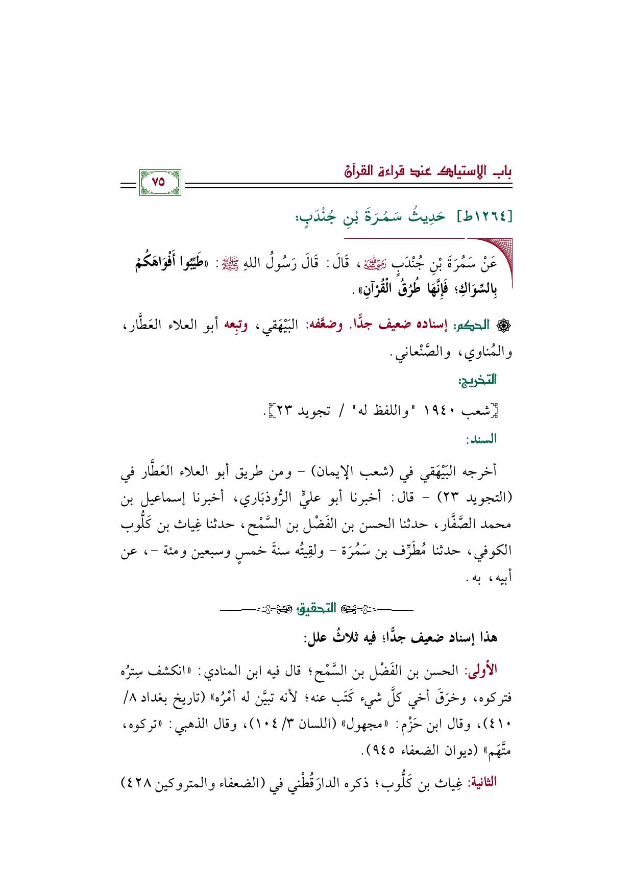 أخرجه البَيْهَقي في (شعب الإيمان) - ومن طريق أبو العلاء العَطَّار في (التجويد ٢٣) - قال: أخبرنا أبو عليٍّ الرُّوذبَاري، أخبرنا إسماعيل بن محمد الصَّفَّار، حدثنا الحسن بن الفَضْل بن السَّمْح، حدثنا غِياث بن كَلُّوب الكوفي، حدثنا مُطَرِّف بن سَمُرَة- ولقِيتُه سنةَ خمسٍ وسبعين ومئة-، عن أبيه، به.
