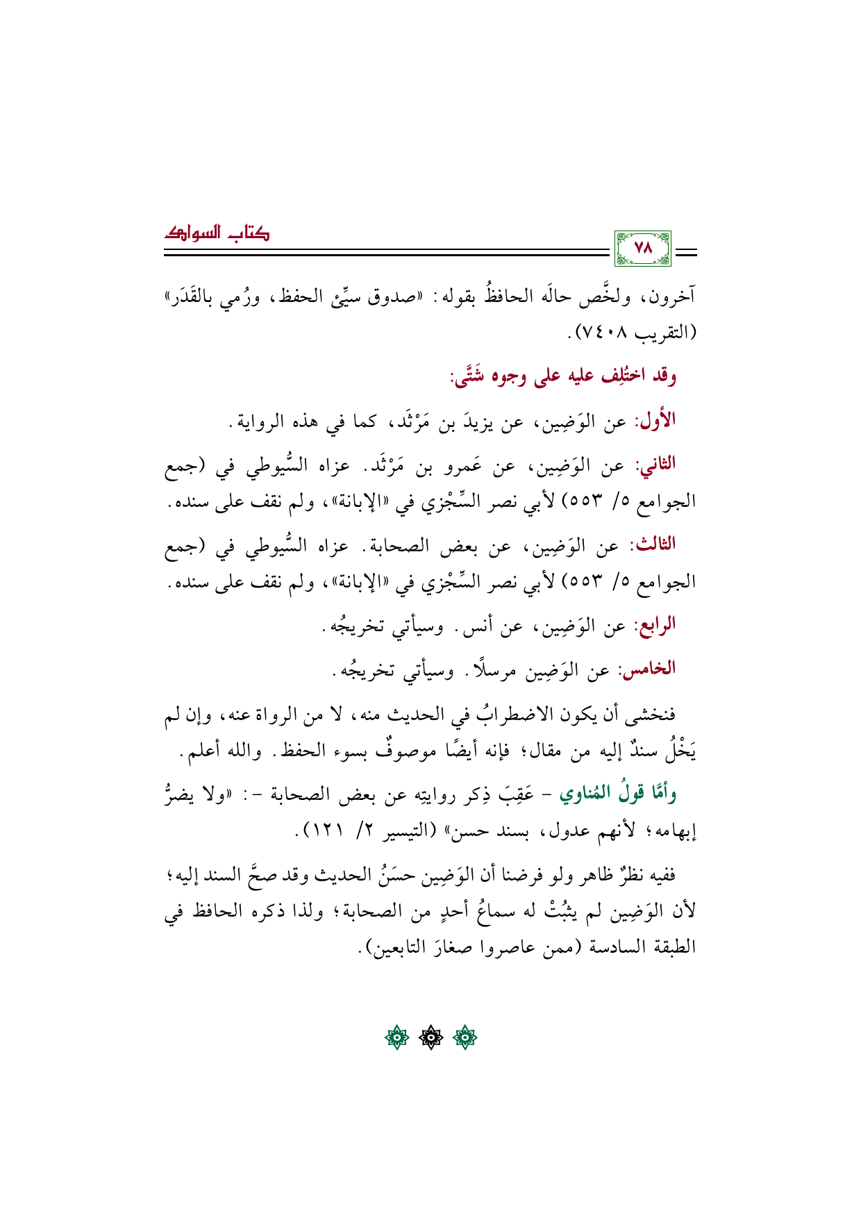 ففيه نظرٌ ظاهر ولو فرضنا أن الوَضِين حسَنُ الحديث وقد صحَّ السند إليه؛ لأن الوَضِين لم يثبُتْ له سماعُ أحدٍ من الصحابة؛ ولذا ذكره الحافظ في الطبقة السادسة (ممن عاصروا صغارَ التابعين).