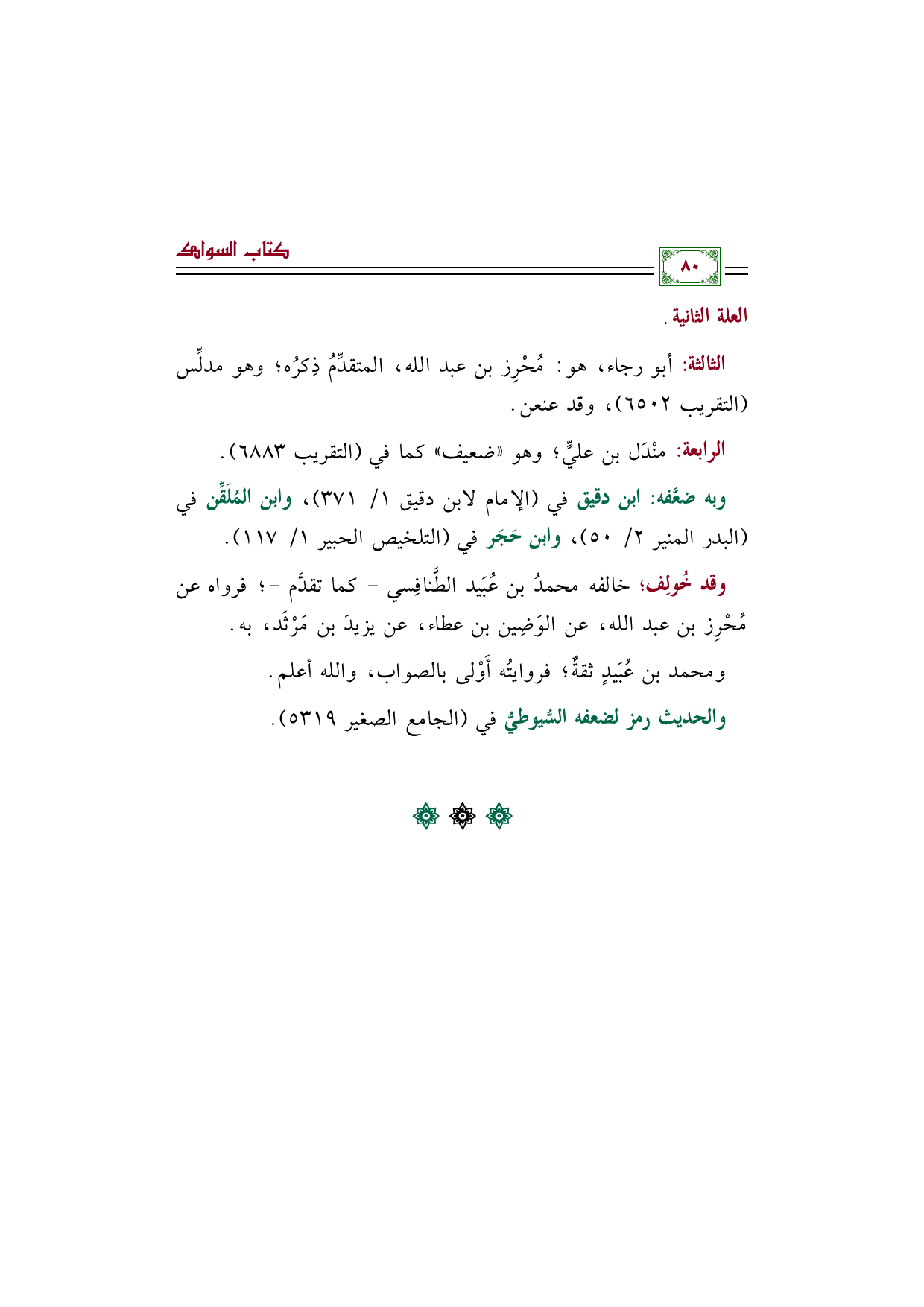 الثالثة: أبو رجاء، هو: مُحْرِز بن عبد الله، المتقدِّمُ ذِكرُه؛ وهو مدلِّس (التقريب ٦٥٠٢)، وقد عنعن.