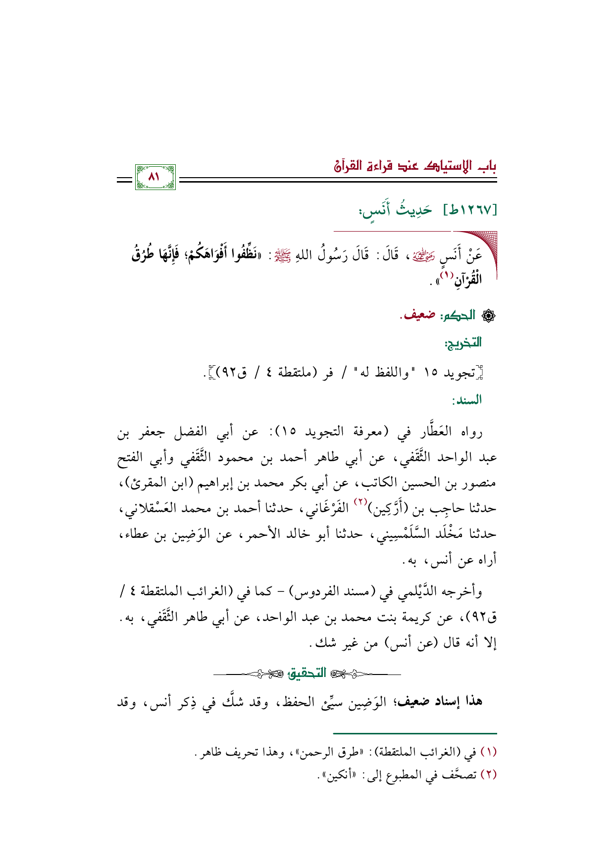 رواه العَطَّار في (معرفة التجويد ١٥): عن أبي الفضل جعفر بن عبد الواحد الثَّقَفي، عن أبي طاهر أحمد بن محمود الثَّقَفي وأبي الفتح منصور بن الحسين الكاتب، عن أبي بكر محمد بن إبراهيم (ابن المقرئ)، حدثنا حاجِب بن (أَرَّكِين) (¬٢) الفَرْغَاني، حدثنا أحمد بن محمد العَسْقلاني، حدثنا مَخْلَد السَّلَمْسِيني، حدثنا أبو خالد الأحمر، عن الوَضِين بن عطاء، أراه عن أنس، به.