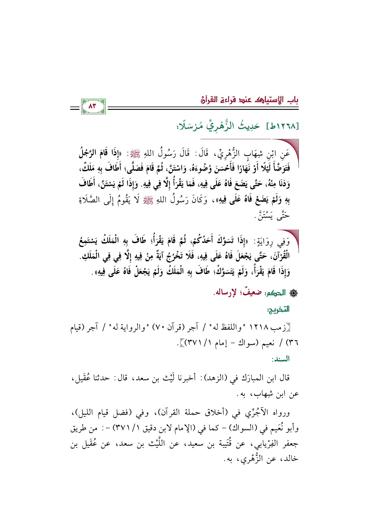 ◼ عَنِ ابْنِ شِهَابٍ الزُّهْرِيِّ، قَالَ: قَالَ رَسُولُ اللهِ صَلَّى اللهُ عَلَيْهِ وَسَلَّمَ: ((إِذَا قَامَ الرَّجُلُ فَتَوَضَّأَ لَيْلًا أَوْ نَهَارًا فَأَحْسَنَ وُضُوءَهُ، وَاسْتَنَّ، ثُمَّ قَامَ فَصَلَّى؛ أَطَافَ بِهِ مَلَكٌ، وَدَنَا مِنْهُ، حَتَّى يَضَعَ فَاهُ عَلَى فِيهِ، فَمَا يَقْرَأُ إِلَّا فِي فِيهِ. وَإِذَا لَمْ يَسْتَنَّ، أَطَافَ بِهِ وَلَمْ يَضَعْ فَاهُ عَلَى فِيهِ))، وَكَانَ رَسُولُ اللهِ صَلَّى اللهُ عَلَيْهِ وَسَلَّمَ لَا يَقُومُ إِلَى الصَّلَاةِ حَتَّى يَسْتَنَّ.