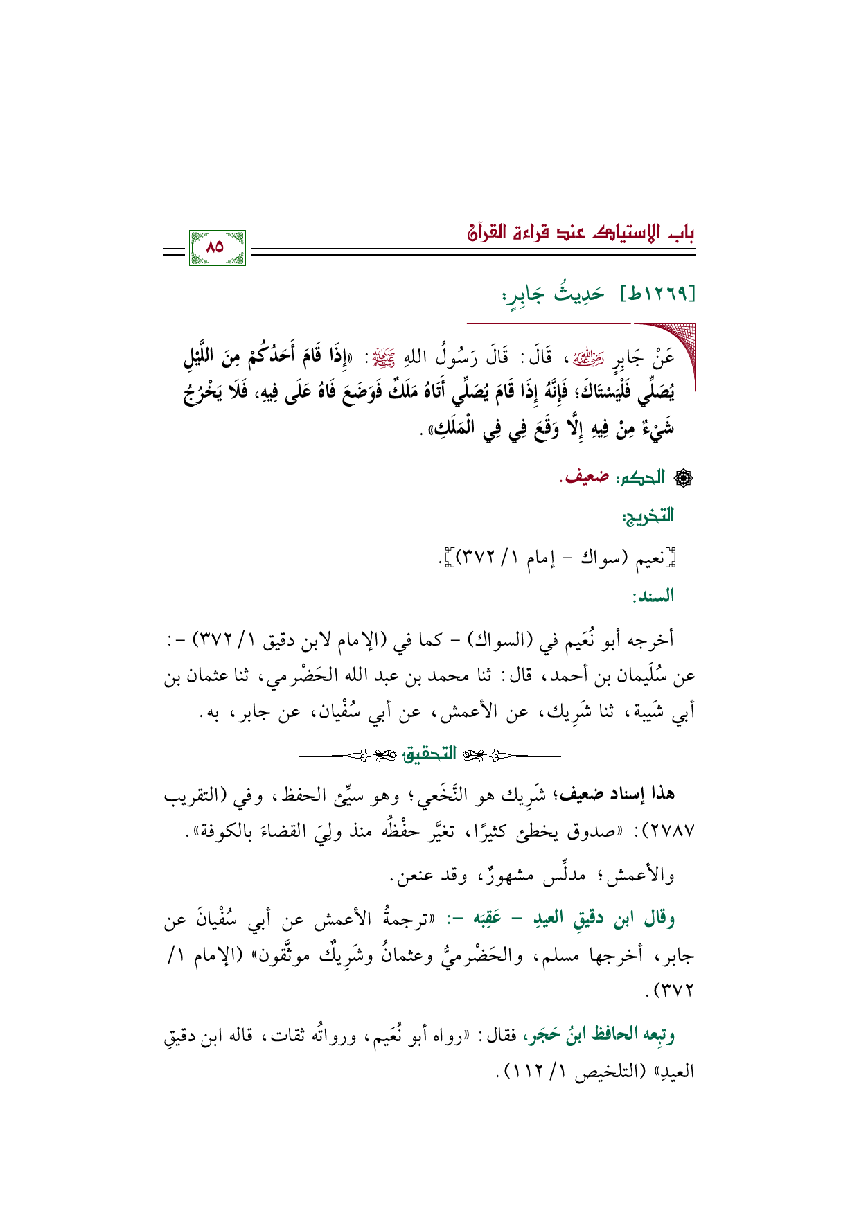 أخرجه أبو نُعَيم في "السواك"- كما في (الإمام لابن دقيق ١/ ٣٧٢) -: عن سُلَيمان بن أحمد، قال: ثنا محمد بن عبد الله الحَضْرمي، ثنا عثمان بن أبي شَيبة، ثنا شَرِيك، عن الأعمش، عن أبي سُفْيان، عن جابر، به.