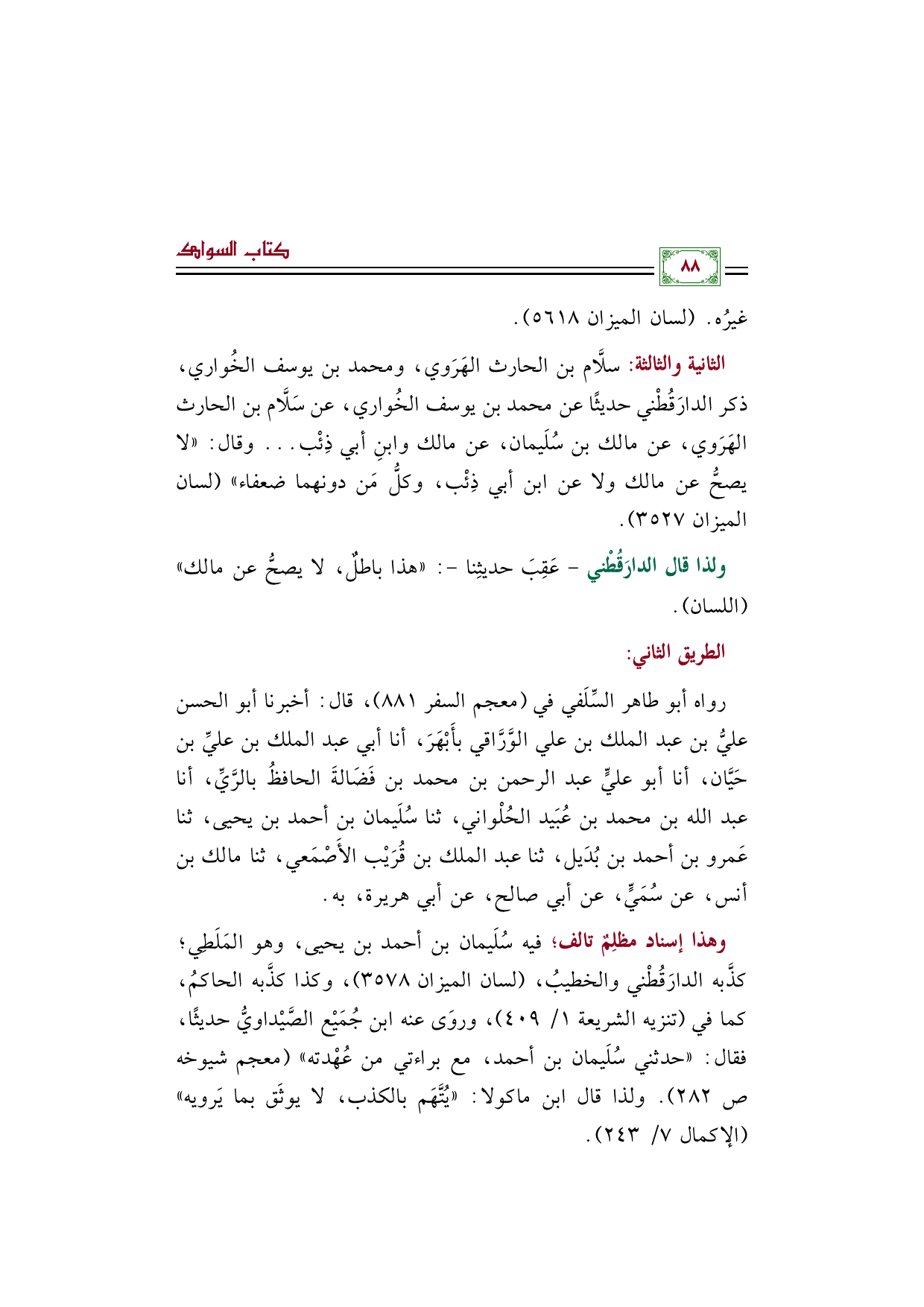 الثانية والثالثة: سلَّام بن الحارث الهَرَوي، ومحمد بن يوسف الخُواري، ذكر الدارَقُطْني حديثًا عن محمد بن يوسف الخُواري، عن سَلَّام بن الحارث الهَرَوي، عن مالك بن سُلَيمان، عن مالك وابنِ أبي ذِئْب ... وقال: "لا يصحُّ عن مالك ولا عن ابن أبي ذِئْب، وكلُّ مَن دونهما ضعفاء" (لسان الميزان ٣٥٢٧).