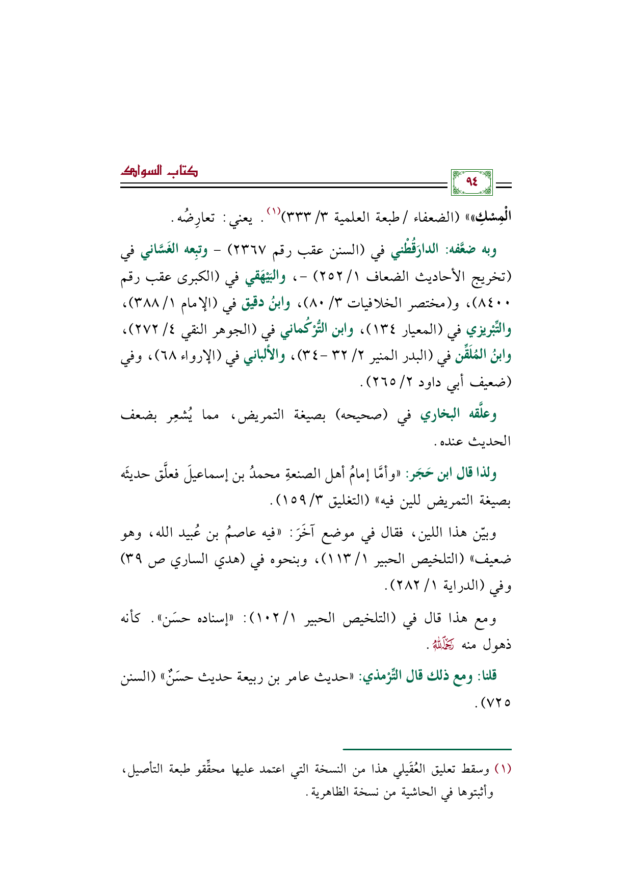 قلنا: ومع ذلك قال التِّرْمذي: "حديث عامر بن ربيعة حديث حسَنٌ" (السنن ٧٢٥).