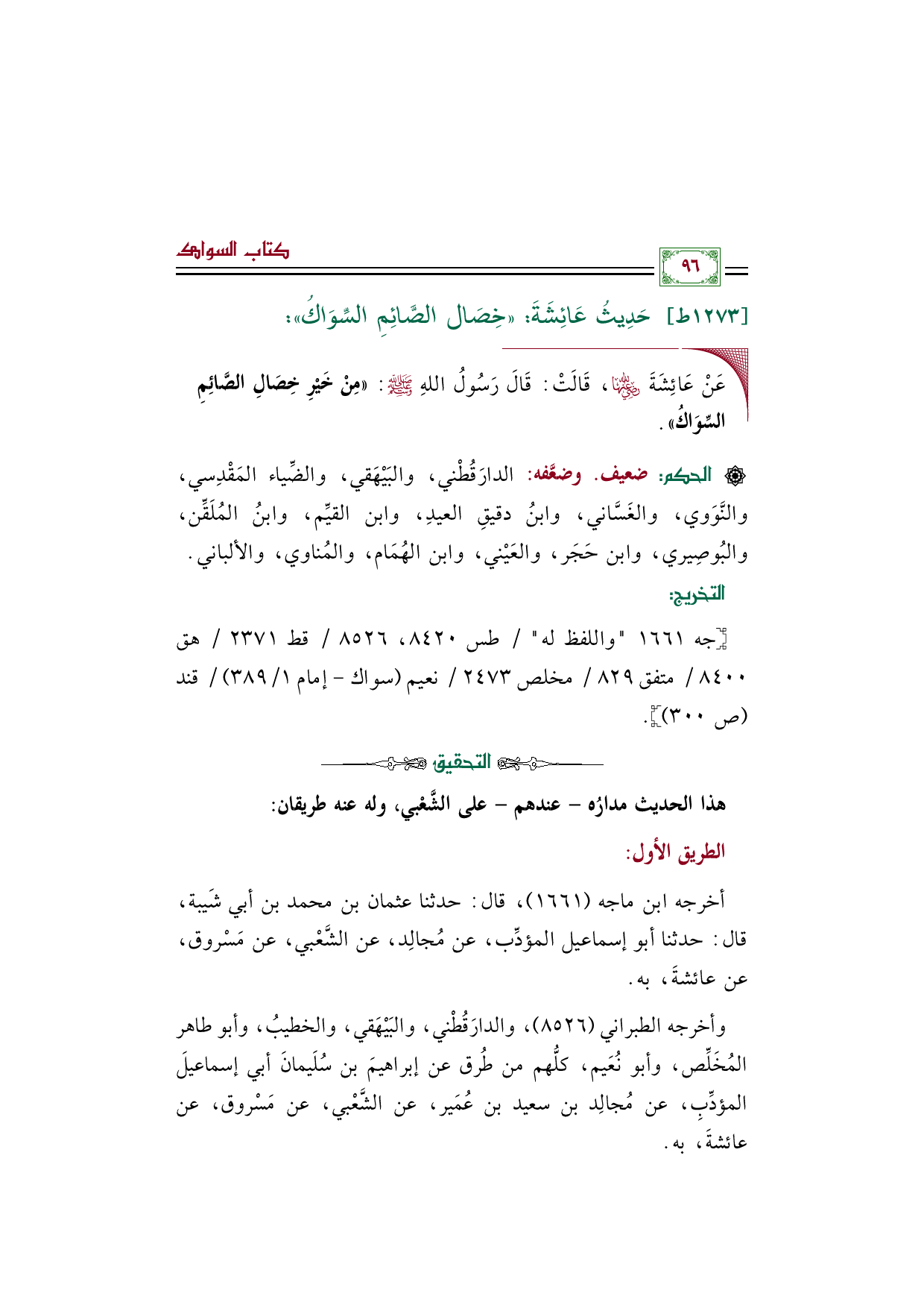 أخرجه ابن ماجه (١٦٦١)، قال: حدثنا عثمان بن محمد بن أبي شَيبة، قال: حدثنا أبو إسماعيل المؤدِّب، عن مُجالِد، عن الشَّعْبي، عن مَسْروق، عن عائشةَ، به.