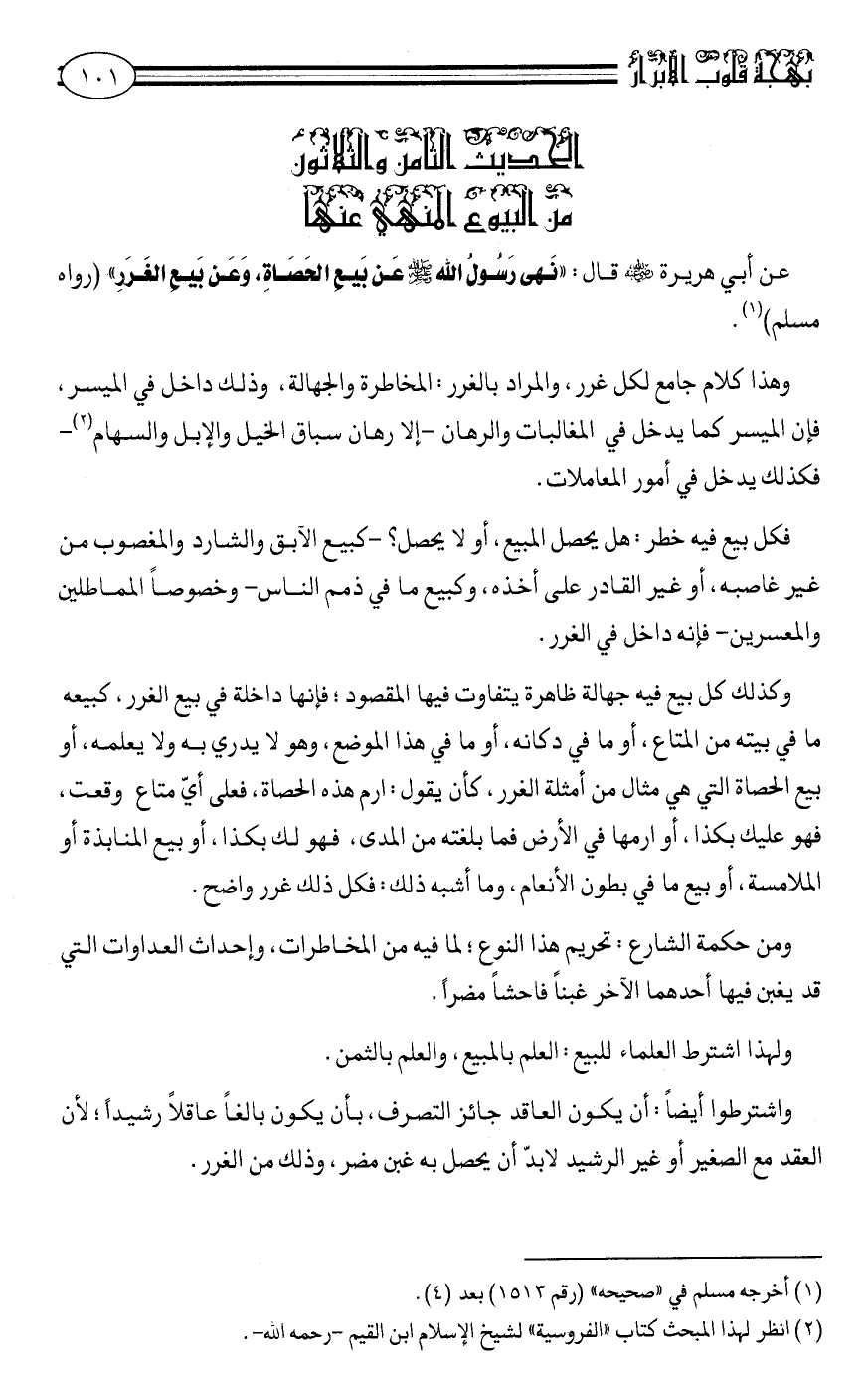 عن أبي هريرة رضي الله عنه قال: "نَهَى رَسُولُ اللَّهِ صلى الله عليه وسلم عَنْ بَيْعِ الْحَصَاةِ، وَعَنْ بَيْعِ الغَرر" رَوَاهُ مسلم1.