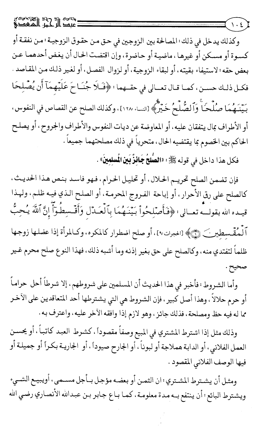وأما الشروط: فأخبر في هذا الحديث أن المسلمين على شروطهم، إلا شرطاً أحل حراماً أو حرم حلالاً، وهذا أصل كبير. فإن الشروط هي التي يشترطها أحد المتعاقدين على الآخر مما له فيه حظ ومصلحة، فذلك جائز. وهو لازم إذا وافقه الآخر عليه، واعترف به.