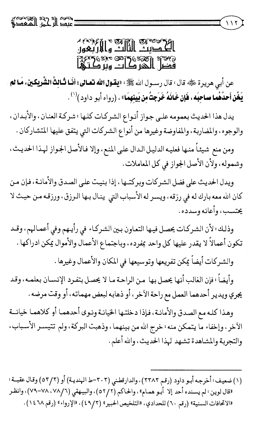عن أبي هريرة رضي الله عنه قال: قال رسول الله صلى الله عليه وسلم: "يَقُولُ اللَّهُ تَعَالَى: أَنَا ثَالِثُ الشَّرِيكَيْنِ، مَا لم يَخُن أحدهما صاحبه. فإن خَانَهُ خَرَجْتُ مِنْ بَيْنِهِمَا" رَوَاهُ أَبُو دَاوُدَ1.