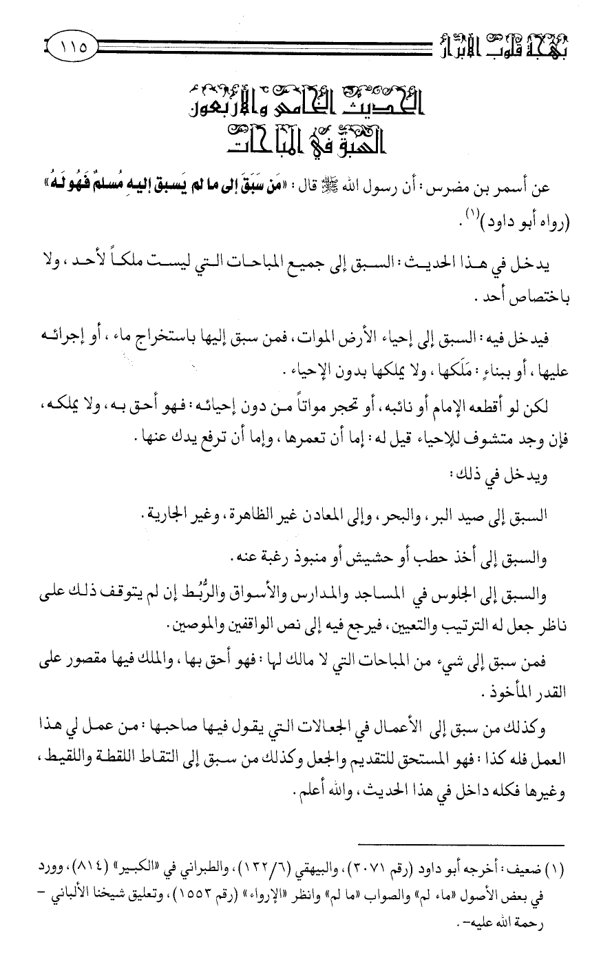 عَنْ أَسْمَرَ بْنِ مُضَرِّسٍ: أنَّ رَسُولَ اللَّهِ صلى الله عليه وسلم قَالَ: "مَنْ سَبَقَ إِلَى مَا لَمْ يَسْبِقْ إِلَيْهِ مُسْلِمٌ فَهُوَ له" رواه أبو داود1.