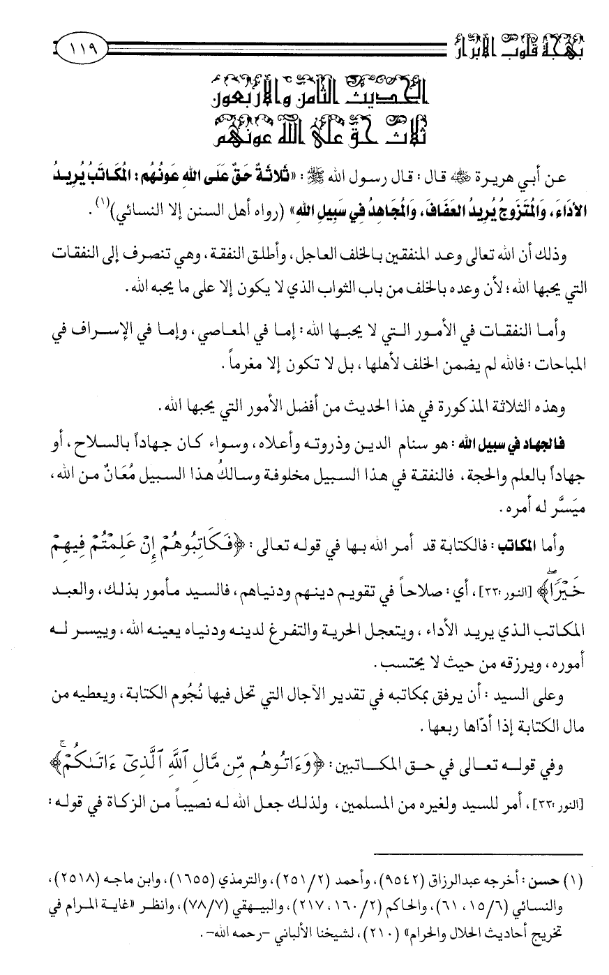 عَنْ أَبِي هُرَيْرَةَ رضي الله عنه قَالَ: قَالَ رَسُولُ اللَّهِ صلى الله عليه وسلم: "ثلاثةٌ حقٌّ على الله عَوْنُهم: المُكاتب يُرِيدُ الْأَدَاءَ، وَالْمُتَزَوِّجُ يُرِيدُ العَفاف، وَالْمُجَاهِدُ فِي سَبِيلِ اللَّهِ" رَوَاهُ أَهْلُ السُّنَنِ إلا النسائي1.