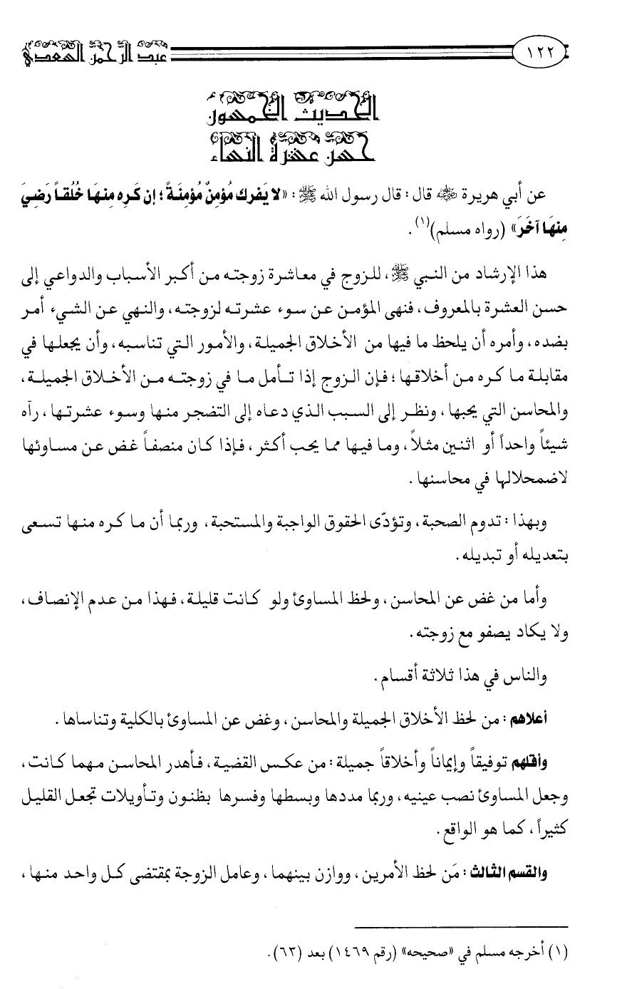 عن أبي هريرة رضي الله عنه قال: قال رسول الله صلى الله عليه وسلم: "لَا يَفْرِك مؤمنٌ مُؤِمْنِةً؛ إِنْ كَرِهَ مِنْهَا خُلقاً رضي منها آخر" رواه مسلم1.