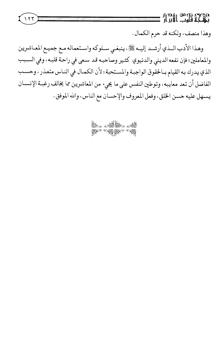 وهذا الأدب الذي أرشد إليه صلّى الله عليه وسلم، ينبغي سلوكه واستعماله مع جميع المعاشرين والمعاملين؛ فإن نفعه الديني والدنيوي كثير وصاحبه قد سعى في راحة قلبه. وفي السبب الذي يدرك به القيام بالحقوق الواجبة والمستحبة؛ لأن الكمال في الناس متعذر. وحسب الفاضل أن تعدَّ معايبه. وتوطين النفس على ما يجيء من المعاشرين مما يخالف رغبة الإنسان يسهل عليه حسن الخلق، وفعل المعروف والإحسان مع الناس. والله الموفق.