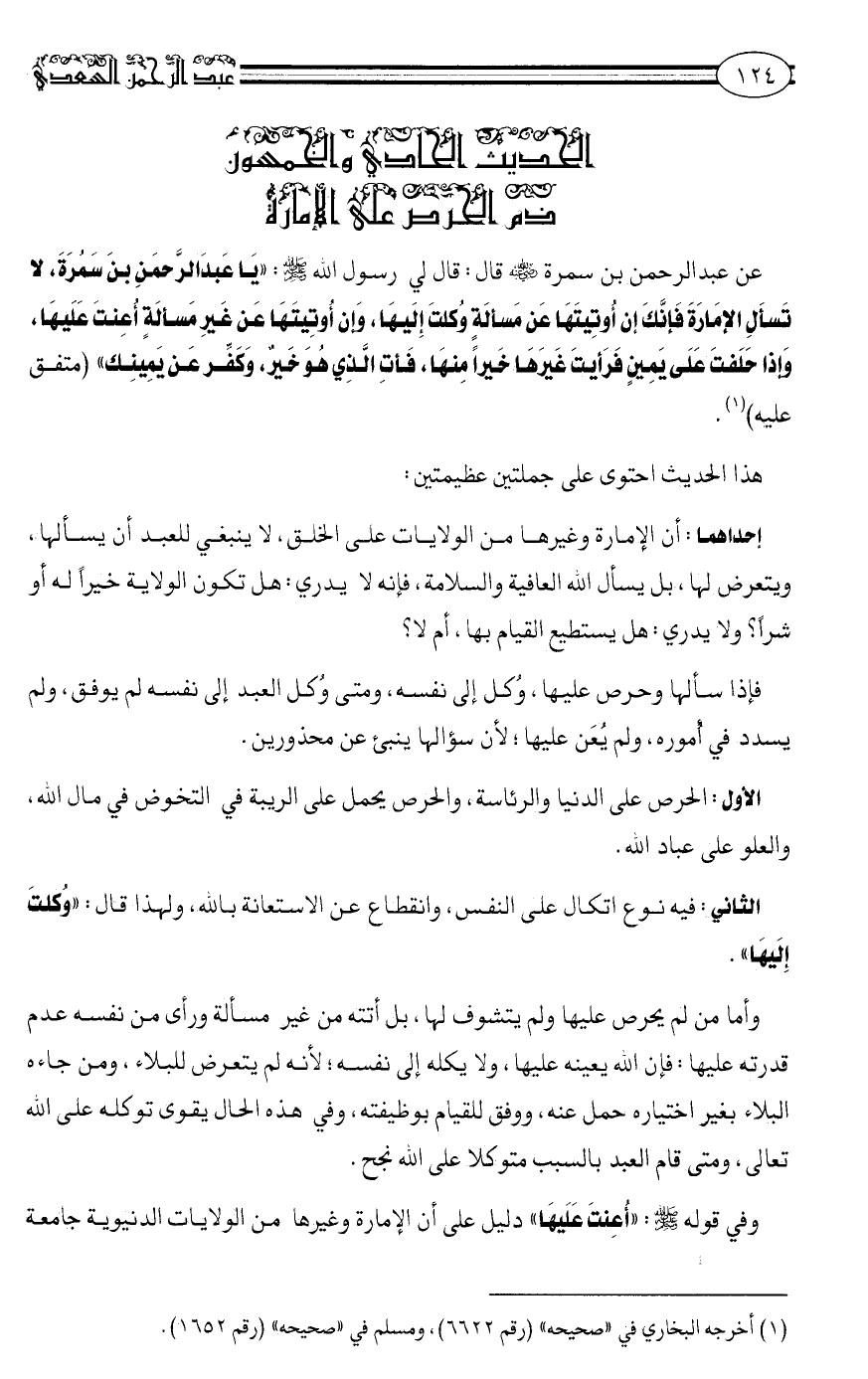 عَنْ عَبْدِ الرَّحْمَنِ بْنِ سَمُرَةَ رضي الله عنه قَالَ: قَالَ لِي رَسُولُ اللَّهِ صلى الله عليه وسلم: "يَا عَبْدَ الرَّحْمَنِ بنَ سَمُرَةَ، لَا تَسْأَلِ الْإِمَارَةَ، فَإِنَّكَ إِنْ أوتيتها عن مسألة وكِّلت إليها، وإن أوتيتها عن غَيْرِ مَسْأَلَةٍ أُعِنْتَ عَلَيْهِا. وَإِذَا حَلَفْتَ عَلَى يَمِينٍ فَرَأَيْتَ غَيْرَهَا خَيْرًا مِنْهَا، فائْتِ الَّذِي هو خير، وكفِّر عن يمينك" متفق عليه1.