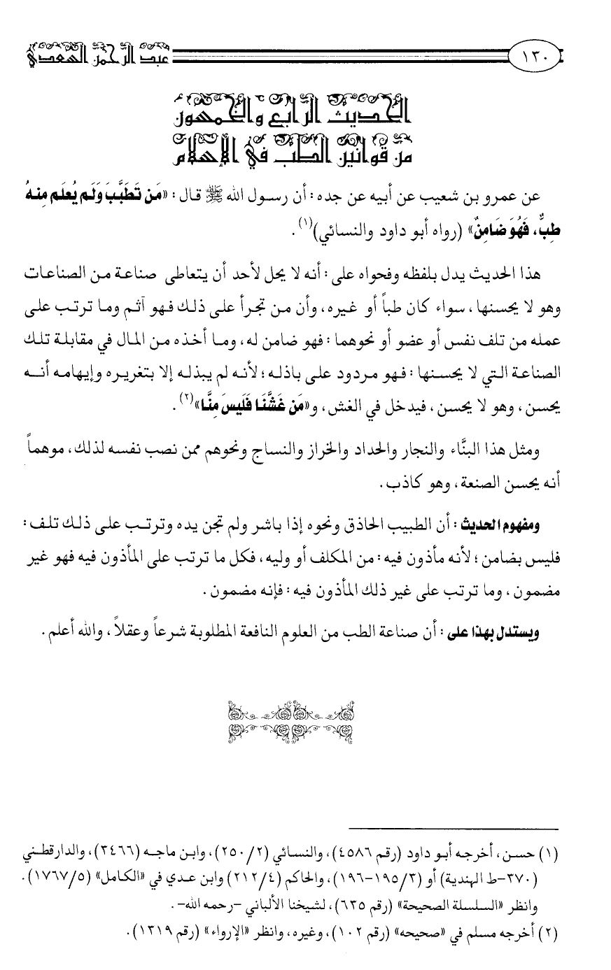 عَنْ عَمْرِو بْنِ شُعَيْبٍ عَنْ أَبِيهِ عَنْ جَدِّهِ: أَنَّ رَسُولَ اللَّهِ صلى الله عليه وسلم قَالَ: "مَنْ تطبَّب وَلَمْ يُعلم مِنْهُ طِبٌّ، فَهُوَ ضَامِنٌ" رَوَاهُ أَبُو دَاوُدَ وَالنَّسَائِيُّ1.