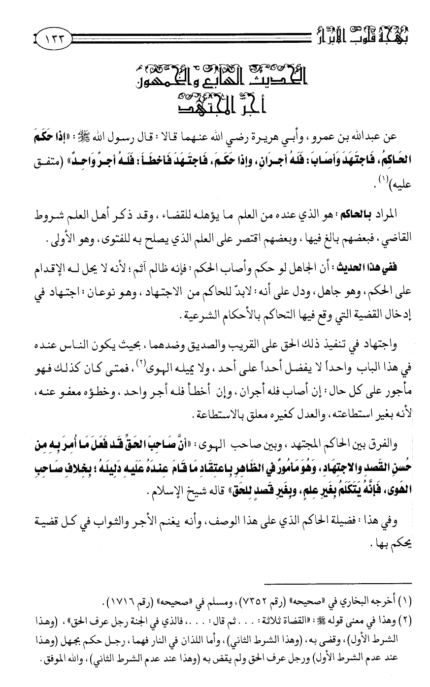 عَنْ عَبْدِ اللَّهِ بْنِ عَمْرٍو، وَأَبِي هُرَيْرَةَ رَضِيَ اللَّهُ عَنْهُمَا قَالَا: قَالَ رَسُولُ اللَّهِ صلى الله عليه وسلم: "إِذَا حَكَمَ الْحَاكِمُ، فَاجْتَهَدَ وَأَصَابَ، فَلَهُ أَجْرَانِ. وَإِذَا حَكَمَ، فَاجْتَهَدَ فأخطأ، فله أجر واحد" متفق عليه1.