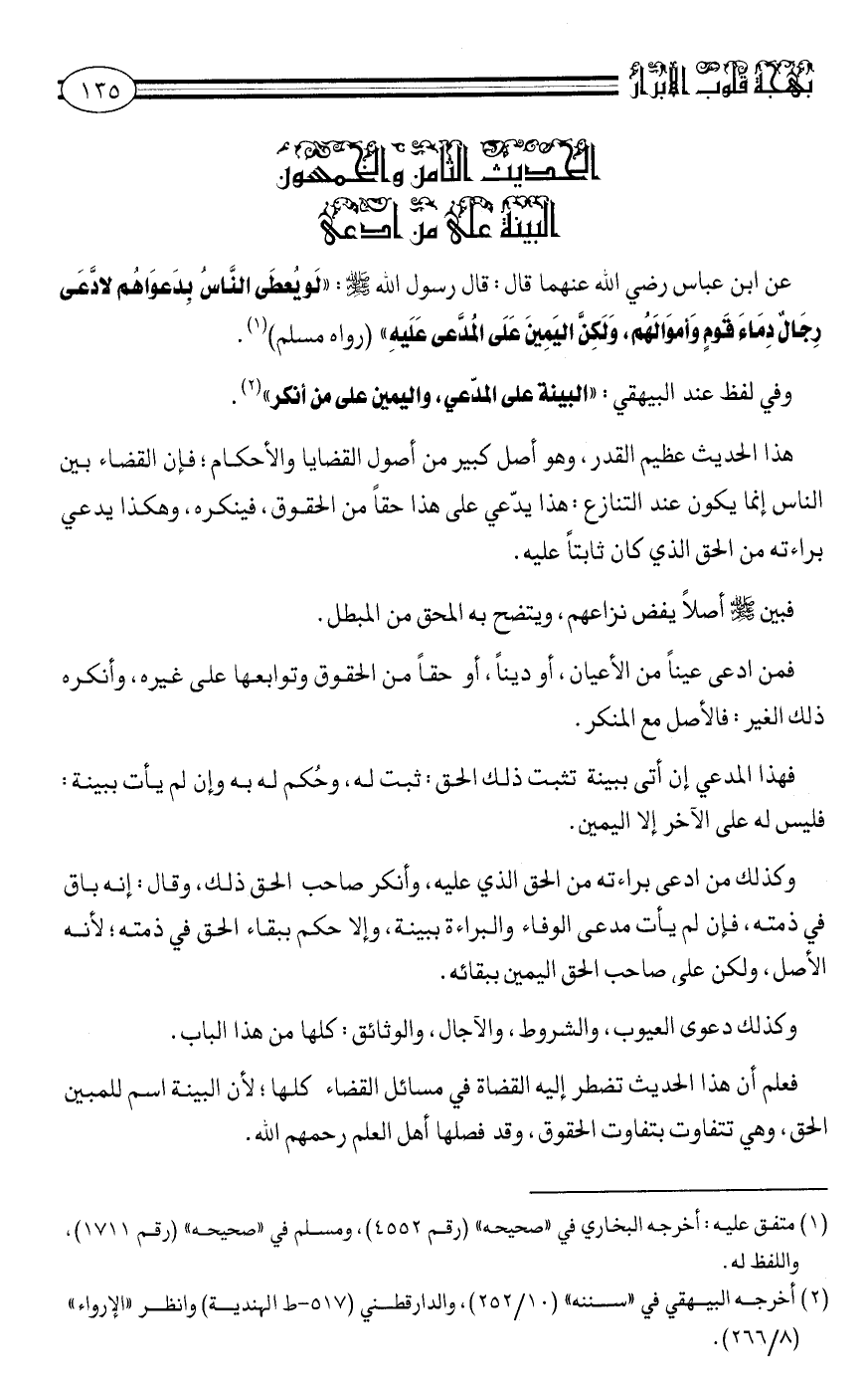 فعلم أن هذا الحديث تضطر إليه القضاة في مسائل القضاء كلها؛ لأن البينة اسم للمبين الحق. وهي تتفاوت بتفاوت الحقوق. وقد فصلها أهل العلم رحمهم الله.