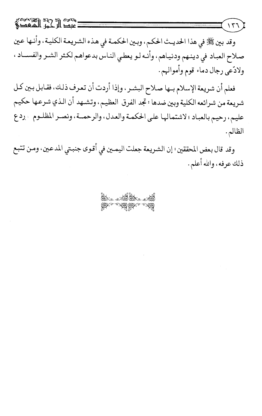 وقد بين صلّى الله عليه وسلم في هذا الحديث الحكم، وبين الحكمة في هذه الشريعة الكلية، وأنها عين صلاح العباد في دينهم ودنياهم، وأنه لو يعطى الناس بدعواهم لكثر الشر والفساد، ولادّعى رجال دماء قوم وأموالهم.