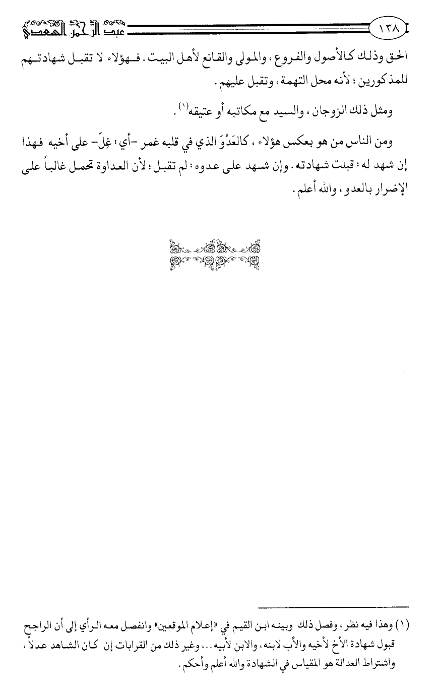 (1) وهذا فيه نظر, وفصّل ذلك ابن القيّم في "إعلام الموقّعين" وانفصل معه الرأي إلى أنّ الراجح قبول شهادة الأخ لأخيه والأب لابنه, والابن لأبيه.... وغير ذلك من القرابات إن كان الشاهد عدلاً, واشتراط العدالة هو المقياس في الشهادة. والله أعلم وأحكم.
