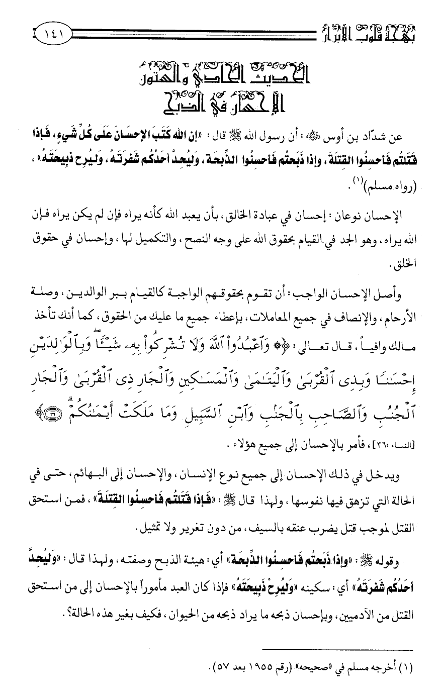 عَنْ شَدَّادِ بْنِ أوْس رضي الله عنه: أَنَّ رَسُولَ اللَّهِ صلى الله عليه وسلم قَالَ: "إِنَّ اللَّهَ كَتَبَ الْإِحْسَانَ عَلَى كُلِّ شَيْءٍ. فَإِذَا قَتَلْتُمْ فأحْسِنوا الْقِتْلَةَ وَإِذَا ذَبَحْتُمْ فَأَحْسِنُوا الذِّبْحَةَ. وَلْيُحِدَّ أَحَدُكُمْ شَفْرَتَهُ ولْيُرِحْ ذَبِيحَتَهُ" رَوَاهُ مسلم1.