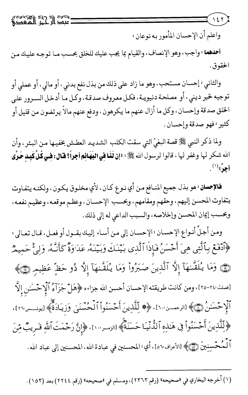 والثاني: إحسان مستحب. وهو ما زاد على ذلك من بذل نفع بدني، أو مالي، أو علمي، أو توجيه لخير ديني، أو مصلحة دنيوية، فكل معروف صدقة، وكل ما أدخل السرور على الخلق صدقة وإحسان. وكل ما أزال عنهم ما يكرهون. ودفع عنهم ما لا يرتضون من قليل أو كثير، فهو صدقة وإحسان.