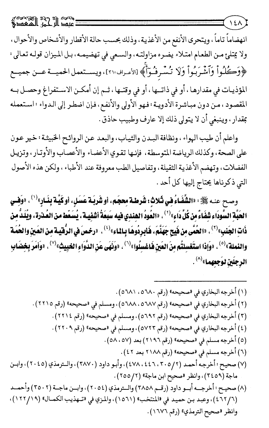 وصحّ عنه صلّى الله عليه وسلم "الشفاء في ثلاث: شَرْطة مِحْجَم، أو شربة عسل، أو كَيَّة بنار"1. "وفي الحبة السوداء شفاء من كل داء"2. "العود الهندي فيه سبعة أشْفِية: يُسَعَّط من العذرة، ويُلَدُّ من ذات الجنب"3، "الحمى من فيح جهنم، فأبردوها بالماء"4، "رخص في الرُّقية من العين والحُمَّة والنملة"5، "وإذا استُغسِلتم من العين فاغسلوا"6، "ونهى عن الدواء الخبيث"7، "وأمر بخضاب الرجلين لوجعهما"8.