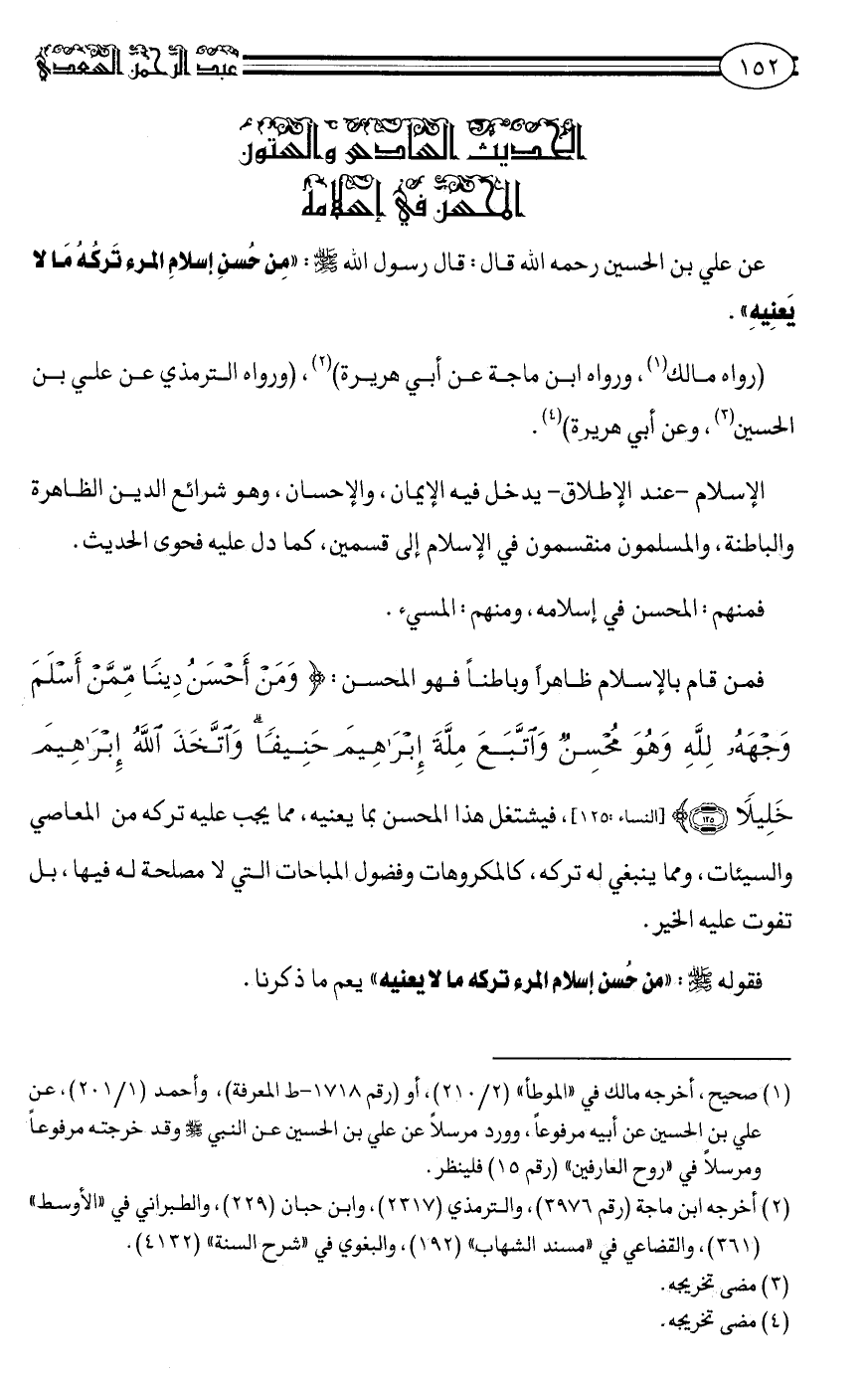 فمن قام بالإسلام ظاهراً وباطناً فهو المحسن {وَمَنْ أَحْسَنُ دِينًا مِّمَّنْ أَسْلَمَ وَجْهَهُ لله وَهُوَ مُحْسِنٌ واتَّبَعَ مِلَّةَ إِبْرَاهِيمَ حَنِيفًا وَاتَّخَذَ اللهُ إِبْرَاهِيمَ خَلِيلاً} [النساء: 125] . فيشتغل هذا المحسن بما يعنيه، مما يجب عليه تركه من المعاصي والسيئات، ومما ينبغي له تركه، كالمكروهات وفضول المباحات التي لا مصلحة له فيها، بل تفوت عليه الخير.