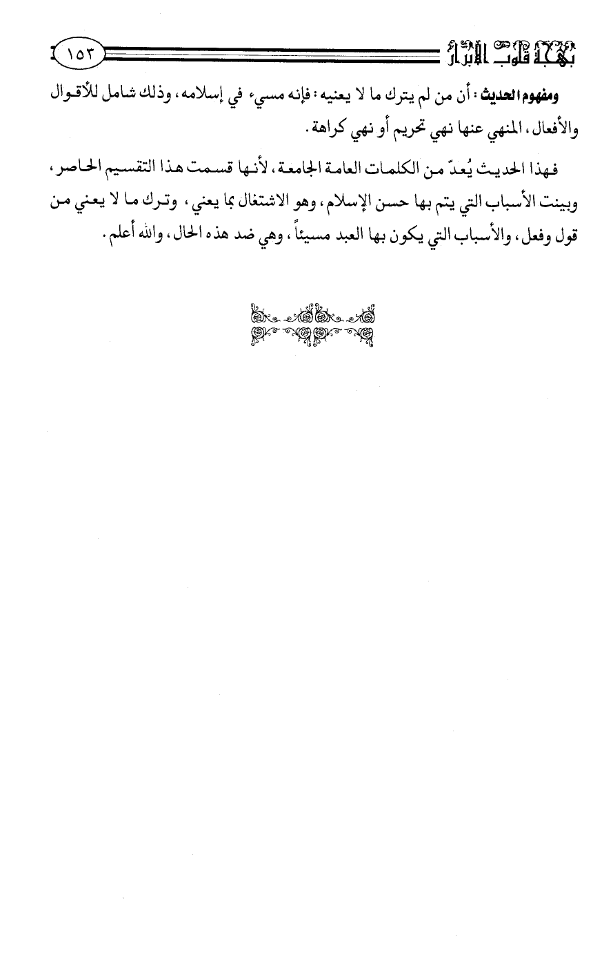 فهذا الحديث يُعدّ من الكلمات العامة الجامعة, لأنها قسمت هذا التقسيم الحاصر، وبينت الأسباب التي يتم بها حسن الإسلام، وهو الاشتغال بما يعني، وترك ما لا يعني من قول وفعل. والأسباب التي يكون بها العبد مسيئاً. وهي ضد هذه الحال. والله أعلم.