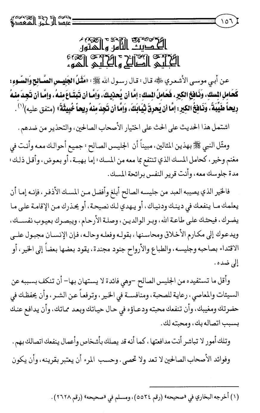 عَنْ أَبِي مُوسَى الْأَشْعَرِيِّ رضي الله عنه قَالَ: قَالَ رَسُولُ اللَّهِ صلى الله عليه وسلم: "مثل الجليس الصالح والسوء: كَحَامِلِ الْمِسْكِ، وَنَافِخِ الكِير. فَحَامِلُ الْمِسْكِ: إِمَّا أَنْ يَحْذِيَك، وَإِمَّا أَنْ تَبْتَاعَ مِنْهُ، وَإِمَّا أَنْ تَجِدَ مِنْهُ رِيحًا طَيِّبَةً. وَنَافِخُ الْكِيرِ: إِمَّا أَنْ يُحْرِقَ ثِيَابَكَ، وِإِمَّا أَنْ تَجِدَ منه ريحاً خبيثة" متفق عليه1.