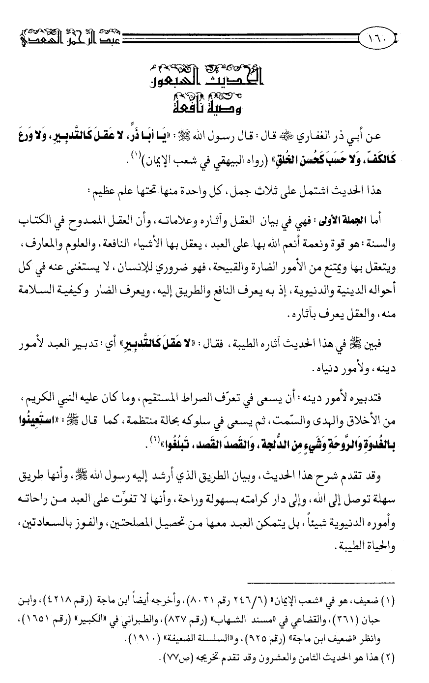 عَنْ أَبِي ذَرٍّ الغِفاري رضي الله عنه قَالَ: قَالَ رَسُولُ اللَّهِ صلى الله عليه وسلم: "يَا أَبَا ذَرٍّ، لَا عَقْلَ كَالتَّدْبِيرِ، وَلَا وَرَع كَالْكَفِّ، وَلَا حَسَبَ كحُسْن الْخُلُقِ" رواه البيهقي في شعب الإيمان1.
