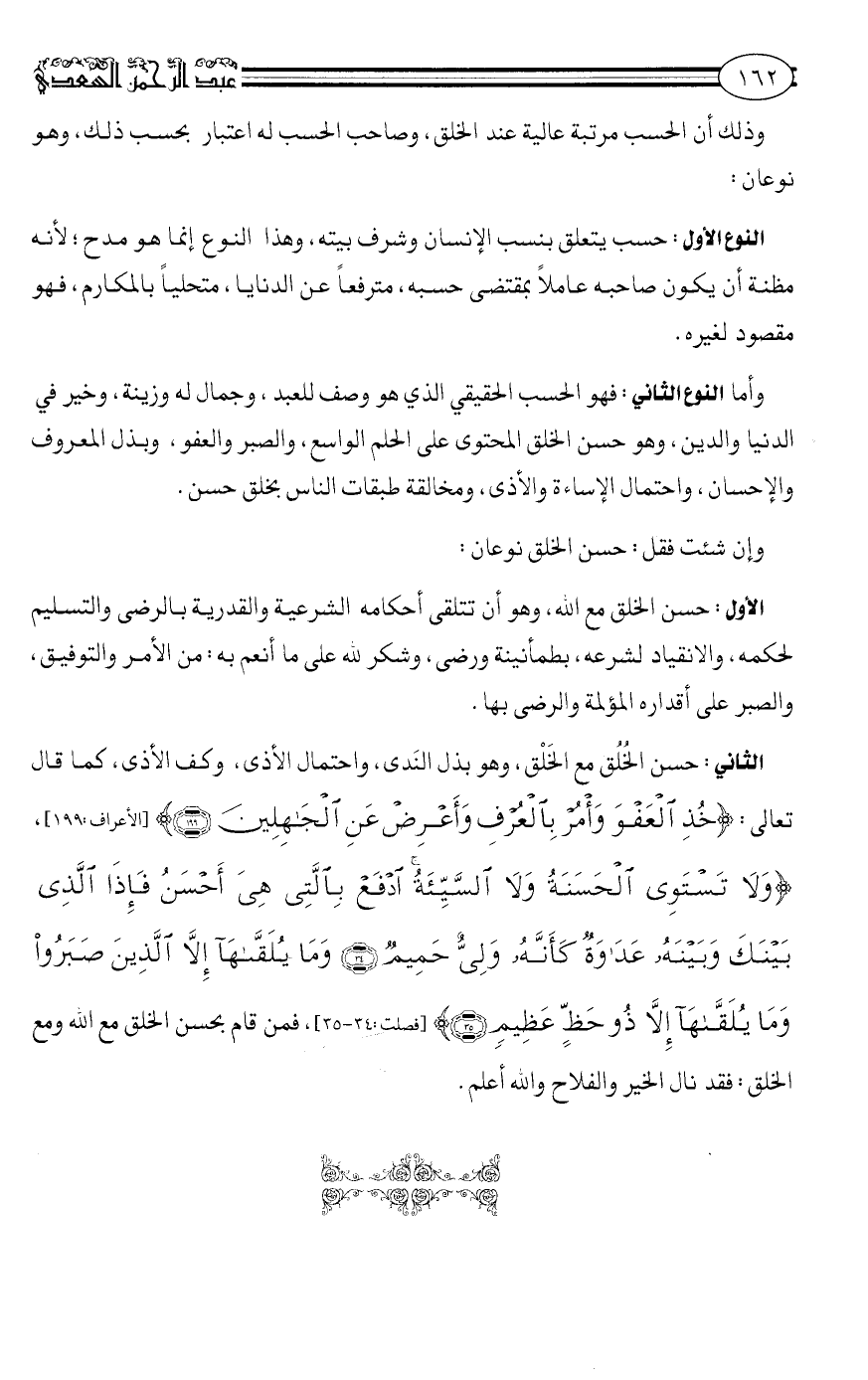 وأما النوع الثاني: فهو الحسب الحقيقي الذي هو وصف للعبد، وجمال له وزينة، وخير في الدنيا والدين، وهو حسن الخلق المحتوي على الحلم الواسع، والصبر والعفو، وبذل المعروف والإحسان، واحتمال الإساءة والأذى، ومخالقة طبقات الناس بخلق حسن.