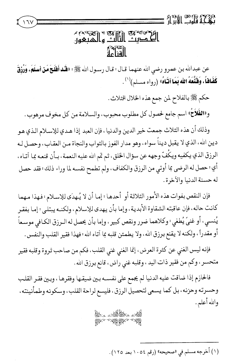 عن عبد الله بن عمرو رضي الله عَنْهُمَا قَالَ: قَالَ رَسُولُ اللَّهِ صلى الله عليه وسلم: "قَدْ أَفْلَحَ مَنْ أَسْلَمَ, ورُزِقَ كَفَافًا, وَقَنَّعَهُ اللَّهُ بِمَا آتَاهُ" رَوَاهُ مُسْلِمٌ1.