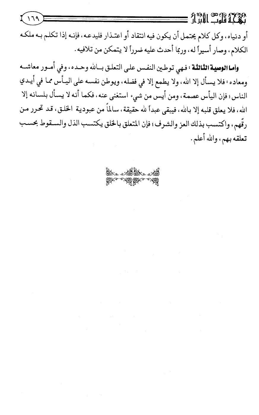 وأما الوصية الثالثة: فهي توطين النفس على التعلق بالله وحده، في أمور معاشه ومعاده، فلا يسأل إلا الله، ولا يطمع إلا في فضله. ويوطن نفسه على اليأس مما في أيدي الناس؛ فإن اليأس عصمة. ومن أيس من شيء استغنى عنه. فكما أنه لا يسأل بلسانه إلا الله، فلا يعلق قلبه إلا بالله. فيبقى عبداً لله حقيقة، سالماً من عبودية الخلق. قد تحرر من رقِّهم، واكتسب بذلك العز والشرف؛ فإن المتعلق بالخلق يكتسب الذل والسقوط بحسب تعلقه بهم. والله أعلم.