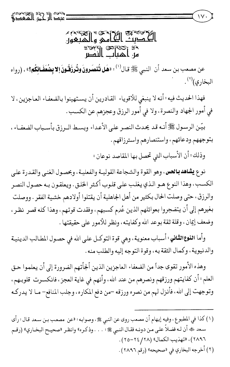 عَنْ مُصْعَبِ بْنِ سَعْدٍ1 أَنَّ النَّبِيَّ صلى الله عليه وسلم قَالَ: "هَلْ تُنْصَرُونَ وَتُرْزَقُونَ إلا بضعفائكم؟ " رواه البخاري2.