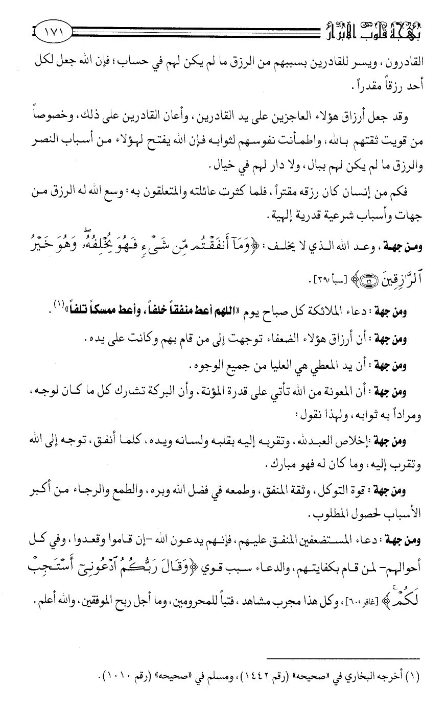 وقد جعل أرزاق هؤلاء العاجزين على يد القادرين, وأعان القادرين على ذلك, وخصوصاً من قويت ثقتهم بالله, واطمأنّت نفوسهم لثوابه فإنّ الله يفتح لهؤلاء من أسباب النصر والرزق ما لم يكن لهم ببال, ولا دار لهم في خيال.