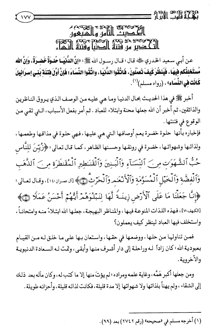 عَنْ أَبِي سَعِيدٍ الْخُدْرِيِّ رضي الله عنه قَالَ: قَالَ رَسُولُ اللَّهِ صلى الله عليه وسلم: "إِنَّ الدُّنْيَا حُلْوَةٌ خَضِرَةٌ. وَإِنَّ اللَّهَ مُسْتَخْلِفُكُمْ فِيهَا، فَيَنْظُرُ كَيْفَ تَعْمَلُونَ، فَاتَّقُوا الدُّنْيَا، وَاتَّقُوا النِّسَاءَ؛ فَإِنَّ أَوَّلَ فِتْنَةِ بْنِي إِسْرَائِيلَ كانت في النساء" رواه مسلم1.