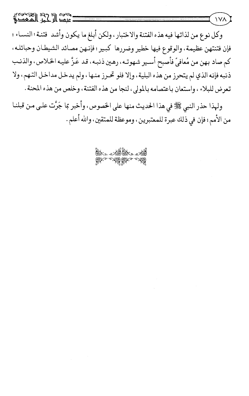 وكل نوع من لذاتها فيه هذه الفتنة والاختبار. ولكن أبلغ ما يكون وأشد فتنة: النساء؛ فإن فتنتهن عظيمة، والوقوع فيها خطير وضررها كبير؛ فإنهن مصائد الشيطان وحبائله، كما صاد بهن من مُعافى فأصبح أسير شهوته، رهين ذنبه، قد عَزَّ عليه الخلاص، والذنب ذنبه فإنه الذي لم يحترز من هذه البلية، وإلا فلو تحرز منها، ولم يدخل مداخل التهم، ولا تعرض للبلاء، واستعان باعتصامه بالمولى، لنجا من هذه الفتنة، وخلص من هذه المحنة.