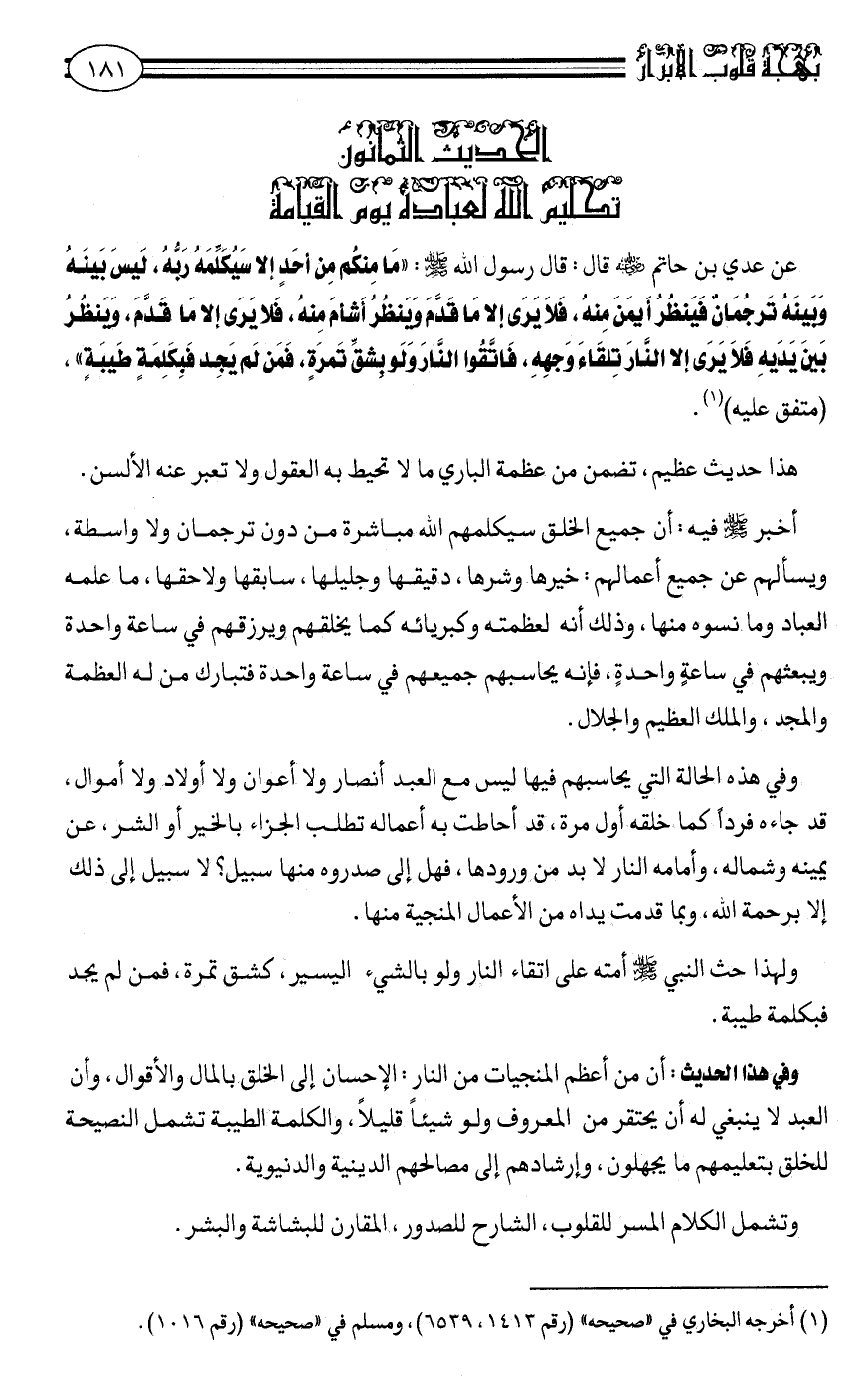 عَنْ عَدِيِّ بْنِ حَاتِمٍ رضي الله عنه قَالَ: قَالَ رَسُولُ اللَّهِ صلى الله عليه وسلم: "مَا مِنْكُمْ مِنْ أَحَدٍ إِلَّا سَيُكَلِّمُهُ رَبُّهُ، لَيْسَ بَيْنَهُ وَبَيْنَهُ تَرْجمان فَيَنْظُرُ أَيْمَنَ مِنْهُ، فَلَا يَرَى إِلَّا مَا قَدَّمَ. وَيَنْظُرُ أشأم مِنْهُ، فَلَا يَرَى إِلَّا مَا قَدَّمَ، وَيَنْظُرُ بَيْنَ يَدَيْهِ فَلَا يَرَى إِلَّا النَّارَ تِلقَاءَ وَجْهِهِ، فَاتَّقُوا النَّارَ وَلَوْ بِشِقِّ تَمْرَةٍ. فَمَنْ لم يجد فبكلمة طيبة" متفق عليه1.