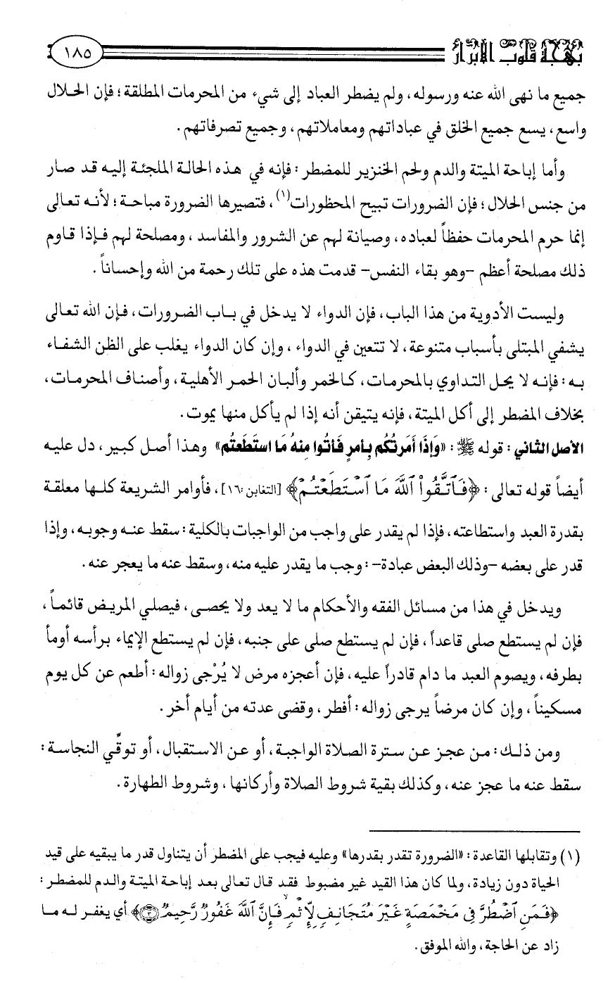 (1) وتقابلها القاعدة: "الضرورة تقدّر بقدرها" وعليه فيجب على المضطر أن يتناول قدر ما يبقيه على قيد الحياة دون زيادة, ولما كان هذا القيد غير مضبوط فقد قال تعالى بعد إباحة الميتة والدم للمضطرّ:} فَمَنِ اضْطُرَّ فِي مَخْمَصَةٍ غَيْرَ مُتَجَانِفٍ لإِثْمٍ فَإِنَّ اللَّهَ غَفُورٌ رَحِيمٌ {أي يغفر له ما زاد عن الحاجة, والله الموفق.